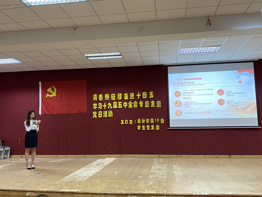 本次主题党日活动共分为四部分:微党课学习、小品展现新时代变化、答题环节、书记总结。活动伊始,全体人员起立奏唱国歌。首先,由钟淑芳同学给大家上微党课,她以PPT讲解和分析,带领我们从国力、经济、民生三方面对十三五经济发展成就进行回顾,我们感受着国家发展带给我们生活、工作、学习等各方面的变化;其次她通过视频《收获与梦想,我眼中的“十三五”和“十四五”》更直观地让我们体会普通老百姓眼中过去5年中国的发展,遥想畅谈未来5年的中国。第二部分是以小品的形式展现新时代变化,由罗文涓、李婉、黄伟绵等5名同学带来小品《支付改变生活,我与未来对话》,科技改变生活,在小品中,我们看到了支付方式的改变给我们生活带来的便利,给商家们带来更多的发展机会,这正是我们科技发展带来的优势,最后小品呼吁:我们不能满足于现状,我们要创造更好的2035,相约在2035的欢呼雀跃之中。活动第三部分为答题环节,题目紧扣党的十九届五中全会的背景和方针,有效加深了同学们对“十四五”内容和精神的了解。