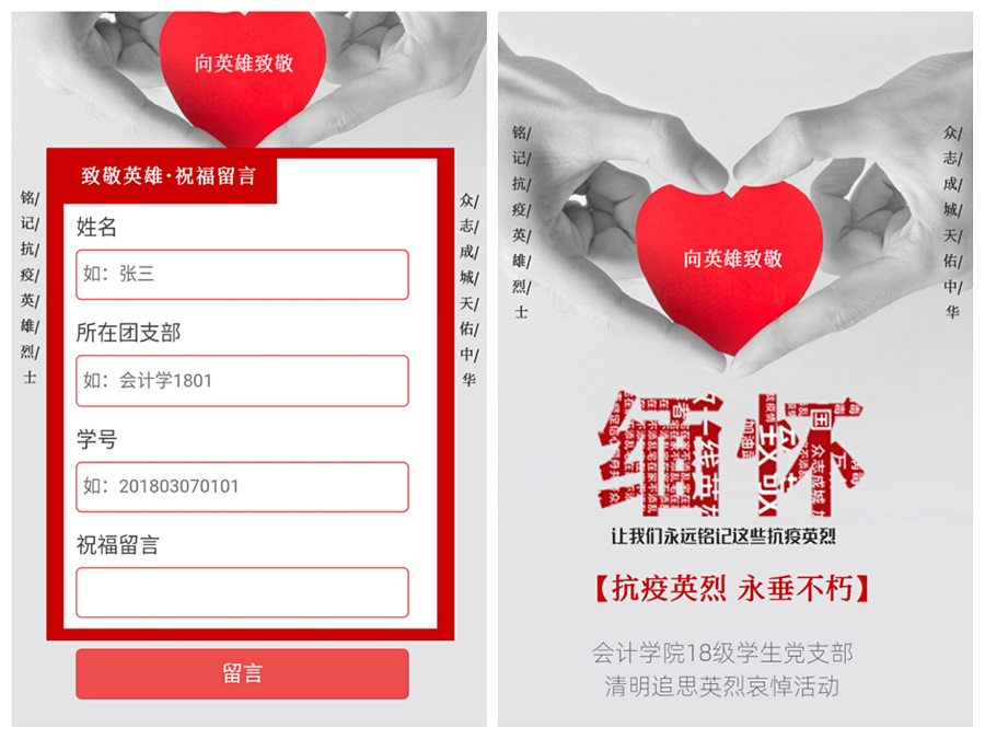 为加强疫情期间的爱国主义教育,提升大学生的社会责任感与历史使命感,深切哀悼在抗击新冠肺炎疫情斗争中牺牲的烈士和逝世的同胞,Beat365官方网站18级学生党支部4月4日至4月6日开展了以“抗疫英雄永垂不朽,让我们永远铭记他们”为主题的清明追思英烈悼念活动。