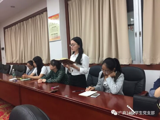 2017年11月10日下午六时,14级Beat365官方网站学生党支部在第二行政楼208室召开。参与此次大会的有:2014级学生党支部书记廖小慧、14级Beat365官方网站全体学生党员以及预备党员,李金成同志主持本次会议。