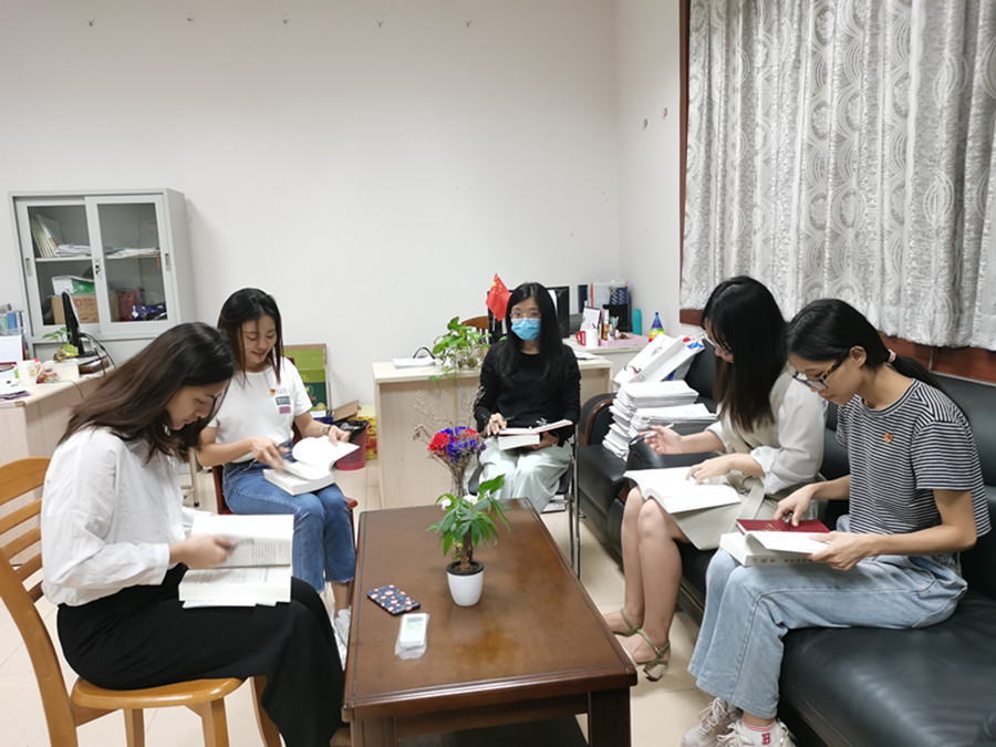 本次支部党员大会主要是阅读分享和讨论新理论。会前,各党员同志已选取《习近平谈治国理政》第三卷部分章节认真阅读。会上,各党员同志根据阅读情况并结合生活学习实际例子分享自己的阅读心得和领悟。曾晓慧同志就《发扬五四精神,不负伟大时光》这篇文章作分享,指出发扬五四精神就要做到爱国爱党、树立社会主义核心价值观和树立学习的紧迫感,作为大学生党员,更要在日常生活学习中起带头作用,以自身的行动影响身边人。邓雪梅同志就《促进人与自然和谐共生》一文细谈自己的观点:要促进人与自然和谐要改变现在高消费、高浪费的思想观念和生活方式,把勤俭节约、保护生态环境的理念贯穿在日常生活中,养成一种良好的生活习惯。陈欣同志以《提高保障和改善民生》一文做分享,她指出习近平总书记在众多的会议和活动中强调要注重民生问题,并以实际例子说明党中央在解决民生问题方面所做的努力,让人民获得幸福感,也提升我们对国家的认同感。此外,陈欣同志结合当前的工作,就如何让学生有归属感和幸福感这个问题提出了建议。谢桉琦同志表示阅读《始终把人民放在最高位置》后深刻感受到“以人民为中心、坚持人民至上”的理念意义,这充分彰显习近平总书记执政为民的博大精神。唐静霓同志结合《全面打好脱贫攻坚战》一文谈其感悟:作为一名高校思想政治教育工作者,面对如何打好攻坚战这个问题,首先要在具体的实践中引导大学生思想,比如带领学生做好暑期三乡下、志愿服务等活动,为国家打好脱贫攻坚战做好积极的宣传教育。