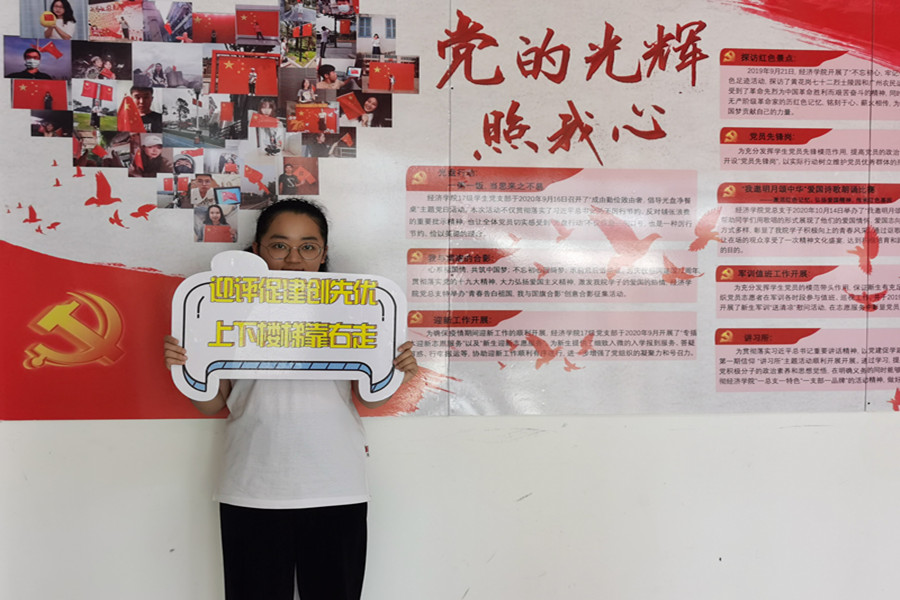 为庆祝建党一百周年,激发广大同学爱党爱国热情,学习党之精神,发扬党之作风。同时鼓励同学们积极参与学院迎评促建的工作,引导Beat365官网同学掀起学习评估知识的热潮,营造“人人关心评估,人人了解评估,人人参与评估”的浓厚氛围,使同学们更加了解学校办学条件、办学质量,更好地迎接本科教学评估工作,向建党一百年献上满意的答卷,Beat365官方网站19级学生党支部在学院党总支的领导下,特开展“展广商形象,迎合格评估,庆建党百年之‘校荣我荣’” 主题党日活动。参与此次活动的成员为Beat365官方网站19级全体学生,活动由徐文慧同学主持。