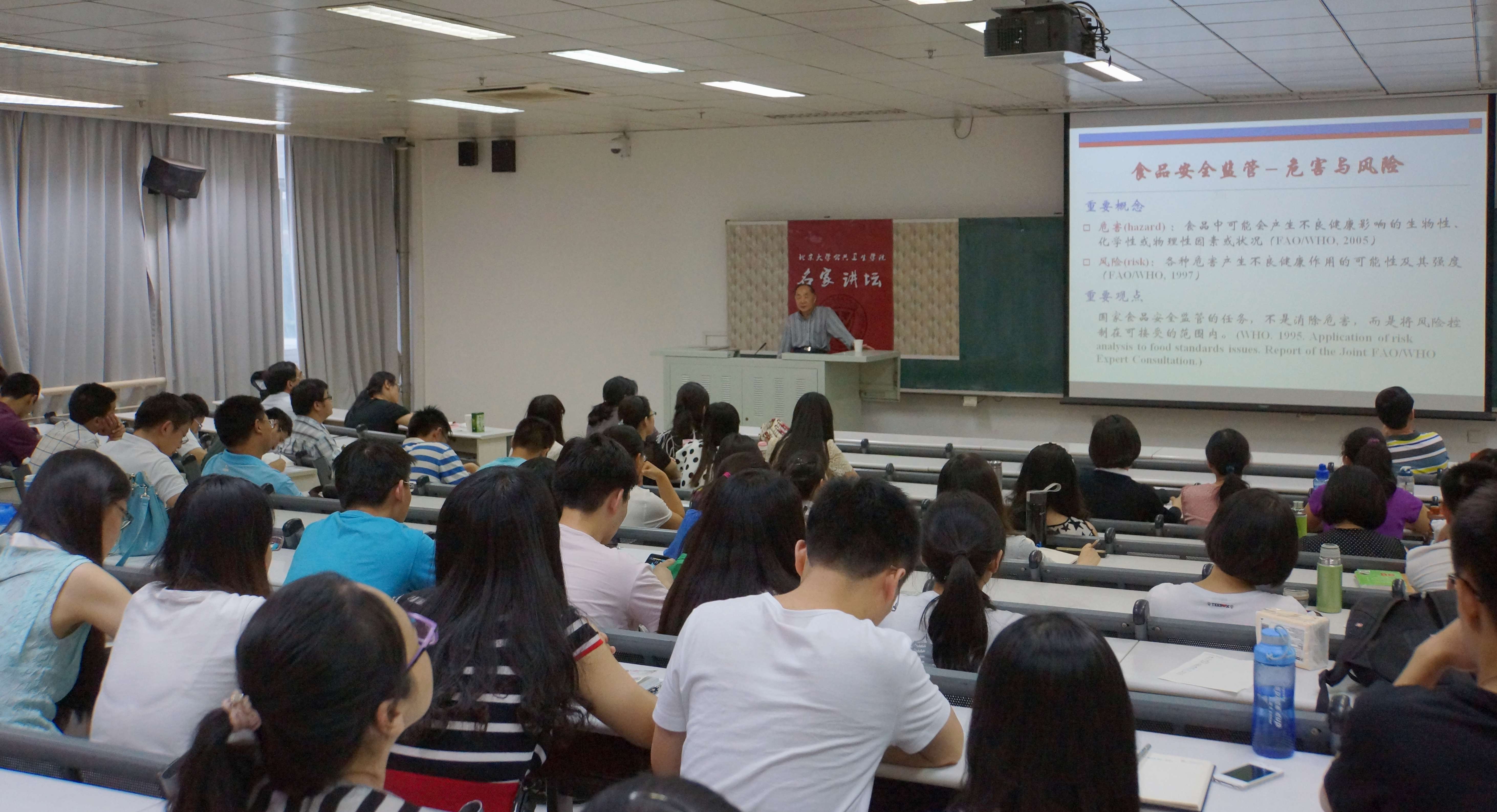 2014年5月26日晚7时,由350vip浦京集团官网举办的系列讲座“350vip浦京集团官网公共卫生名家讲坛”在逸夫教学楼408教室举行,中国工程院院士、现任国家食品安全风险评估中心总顾问、国家食品安全风险评估专家委员会主任委员、国家食品安全标准审评委员会副主任委员、国际食品添加剂法典委员会主席、世界卫生组织食品安全专家团成员、国际生命学会中国办事处主任、美国康奈尔大学营养科学系和香港中文大学兼任教授、中国毒理学会名誉理事长陈君石教授作为主讲嘉宾,来自350vip浦京集团官网及医学部内外的本科生、研究生、青年教师近百人到场聆听了讲座。讲座由350vip浦京集团官网党委书记郝卫东教授主持。