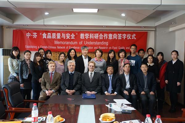 11月25日中国与芬兰“食品质量与安全教学科研合作备忘录” 签字仪式在350vip浦京集团官网举行。芬兰TURKU大学数学与自然科学部部长Tapio Salakoski教授、杨宝茹教授及芬兰驻华使馆公使衔参赞尤森及二秘,350vip浦京集团官网院长孟庆跃教授、郝卫东副院长、王培玉副院长、任涛副院长,营养学系张玉梅教授及健康教育学系、营养学系研究生等参加签字仪式。