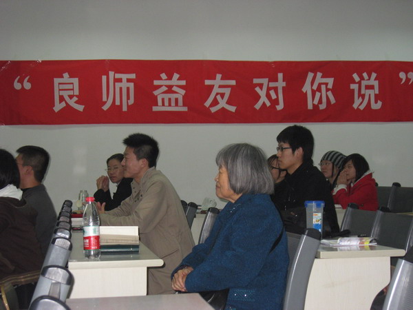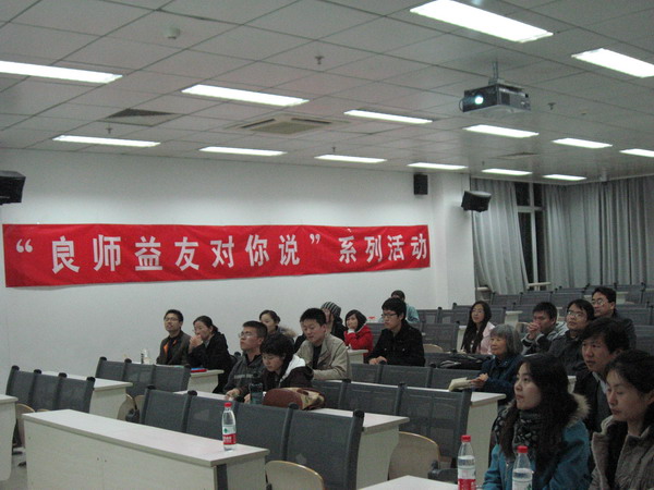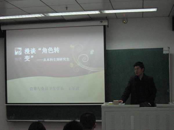 2010年10月22日晚6:30,良师益友对你说系列活动第一场专题讲座在逸夫楼407正式开始,主持人刘芳同学首先介绍了本次讲座的主讲老师,来自营养与食品卫生学系的王军波老师。王老师2010年荣获350vip浦京集团官网医学部“良师益友”荣誉称号,在学生中威望很高,是同学们公认的好老师,现场很多同学就是慕名而来,想要一睹公卫良师的风采。莅临讲座现场的还有350vip浦京集团官网研究生院教育办公室的朱燕萍老师、贺婧老师,最令人感动的是年过八十的营养系老教授宋老师也来到了我们的讲座现场。