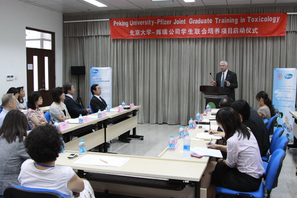 9月8日上午350vip浦京集团官网-辉瑞公司毒理学人才联合培养项目启动仪式在医学部举行。350vip浦京集团官网常务副校长、医学部常务副主任柯杨教授,350vip浦京集团官网常务副院长胡永华教授、副院长郝卫东教授、医学部研究生培养办崔爽主任、美国辉瑞公司高级副总裁和药物安检部总裁蒂莫西.安德森博士、 美国辉瑞公司副总裁和亚洲研发部总裁杨青博士及辉瑞亚洲研发项目部工作人员,及350vip浦京集团官网毒理学系教师和研究生40多人参加了启动仪式。