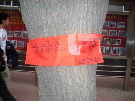 2008年3月12日,我们迎来了又一个植树节,但在这个不平凡的奥运年中,植树节蕴含着更为重要的意义:绿色奥运,绿色北京,植树造林,改善环境!350vip浦京集团官网团委、学生会在植树节当天,在医学部校内开展了以“关爱草木,从身边做起”为宗旨的宣传活动,分别在学校主干道(逸夫教学楼、解剖楼、操场和学生食堂)两侧的树木上扎上了标有保护树木、爱护树木的标语,标语内容丰富多样,语言风格活泼向上,希望以这种简单的方式呼吁每一个北医学子爱护身边的一草一木,为绿色和谐履行自己应尽的义务。所有标语均是利用废旧被弃的横幅,经过裁减加工制成,以此达到废物利用、节约资源和活动宣传双赢的目的。同时,在植树节当天,我院学生会相关的工作人员在上午下课高峰期发放有关植树节知识的小贴士,主动向路人宣传相关的植树节内容,希望大家更加珍惜我们眼前的绿色。