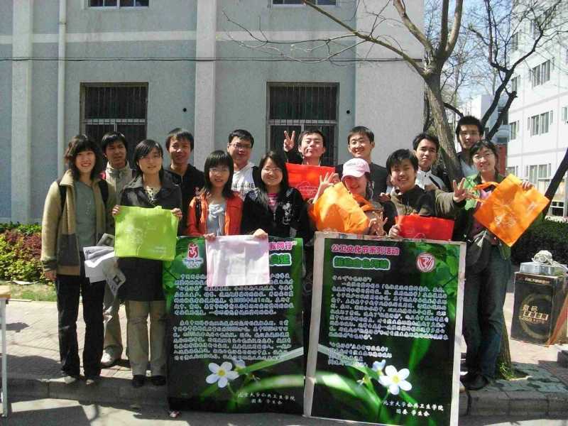 为了迎接即将到来的08年北京奥运会,宣传“绿色奥运”从2008年6月1日起北京各大超市将不再提供免费塑料袋举措, 4月2日中午,350vip浦京集团官网学术文化节之“迎接绿色奥运,拒绝白色污染”活动在5号楼前热闹进行,答题者从题目箱中随机抽取题目,当场作答,答对者获得布袋一个,此项活动吸引了众多同学的驻足参与。五彩的布袋,漂亮精致的“公卫学术文化节”海报,伴着同学们“答奥运问题,赢环保布袋”、“轻松答题,快乐领奖”的宣传,更有获奖者惊喜的呐喊,这一切让本来安静的校园顿时充满了生机,充满了欢笑。不到半个小时,所有环保布袋就已都发送完毕。