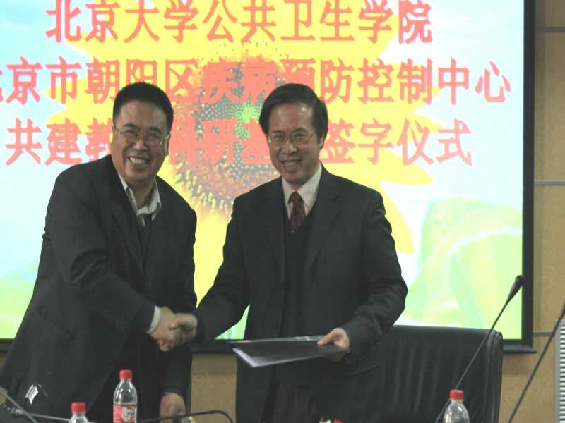 签字仪式由朝阳区卫生局副局长师伟主持,他在介绍双方来宾后讲到特别感谢北大350vip浦京集团官网一直以来的支持与帮助,特别是在SARS期间派流行病学专家曹卫华教授来帮助工作。在最艰难的时刻曹教授始终与他们坚持在一线做了很多工作,调查、建议、培训等,圆满完成任务,得到上级好评。胡永华院长发言中首先感谢朝阳区疾病预防控制中心一直以来对学院的支持,双方在科研、教学方面有很好的合作,已经有学生在这儿实习。随后他介绍了350vip浦京集团官网情况,并希望加强科研合作与学术交流。