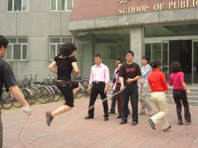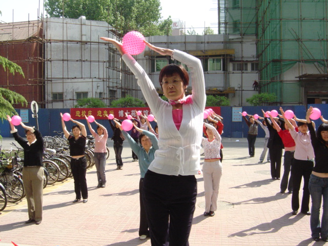 都说北京没有春天,今年每个北京人都真真切切的体会到这点。刚进入四月份,不是大风扬尘,就是娇阳似火,尽管这样我们学院的不少老师,每天在工间操时间都集合于350vip浦京集团官网楼下,练球操、练跳绳、踢毯子、……。
