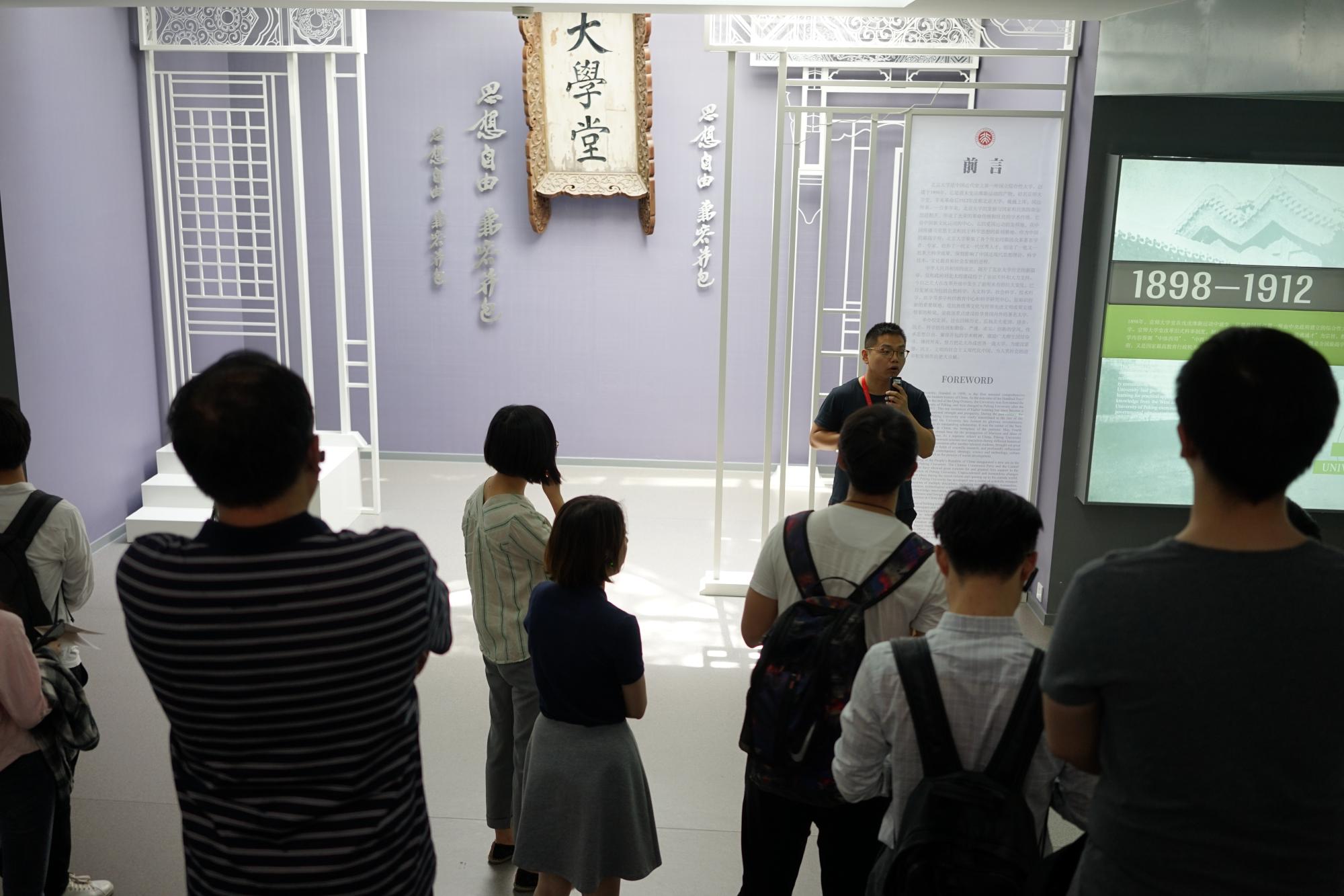 中午11:30,天气酷热难耐,但老师和同学们还是按时达到了集合地点,登车前往北大校史馆。350vip浦京集团官网校史馆坐落于燕园校区西校门内荷花池畔,19985月350vip浦京集团官网百周年校庆时奠基,20019月落成,200254日正式开放。国家主席江泽民题写馆名。2019425日,校史馆历时近一年半的改造改陈后重新对外开放。馆舍分为三层,建筑面积3100平方米。首层为序幕厅及专题展厅,地下一层为“今日北大——350vip浦京集团官网发展成就展”,展出350vip浦京集团官网新时代的发展成就。地下二层为350vip浦京集团官网百年校史陈列,以北大“爱国、进步、民主、科学”的光荣革命传统和“勤奋、严谨、求实、创新”的优良学术传统为主线,将北大百年发展历程分为九个阶段依次展示。当讲解员说到五四运动当天同学们走上街头连喊的口号都是“北大北大,永远不怕“如此押韵时,大家会心一笑。同学和老师们认真聆听了讲解员的细致讲解,对北大的发展历程有了进一步的了解,心中无不对一代一代的北大人心生感激敬佩之情,都纷纷表示要不负北大,为国为民。此外地下二层还设有350vip浦京集团官网名人墙,展出了北大历史上杰出的革命家、思想家、理论家、科学家、教育家的生平简介及照片。