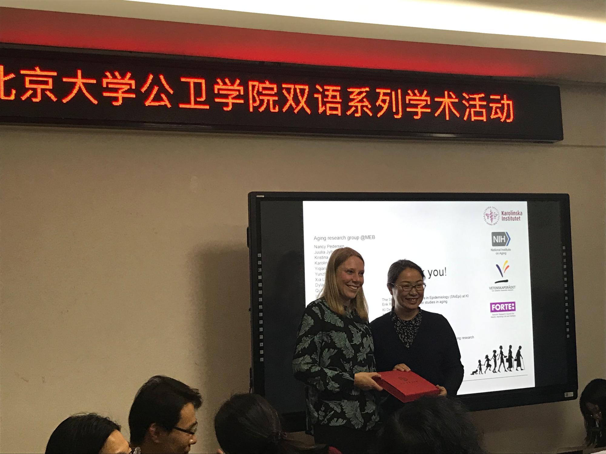 本次讲座的题目为《Epigenetic analyses of aging: evidence from longitudinal cohorts》,衰老是当今的热点话题,更是当前热门的研究方向。Sara教授收集了来自SATSA(Swedish Adoption/Twin Study of Aging)队列中的DNA甲基化样本,在双生子中开展了有关表观遗传学改变和和衰老进程的前瞻性队列研究。Sara教授从Epigenetic drift;Epigenetic clock和Epigenetic mutation三方面验证了表观遗传学改变可以通过不同CpG区域的改变来影响衰老的进程。Sara教授的分享为在座师生的相关研究带来了新的思路,大家在分享结束后积极提问,与教授热情讨论相关问题,互相分享在学术科研过程中的问题与经验。Sara教授更是十分有心地为我们准备了卡洛琳斯卡学院的小礼品和介绍手册。相信我院师生通过这次讲座获得了学术上的启发和帮助。