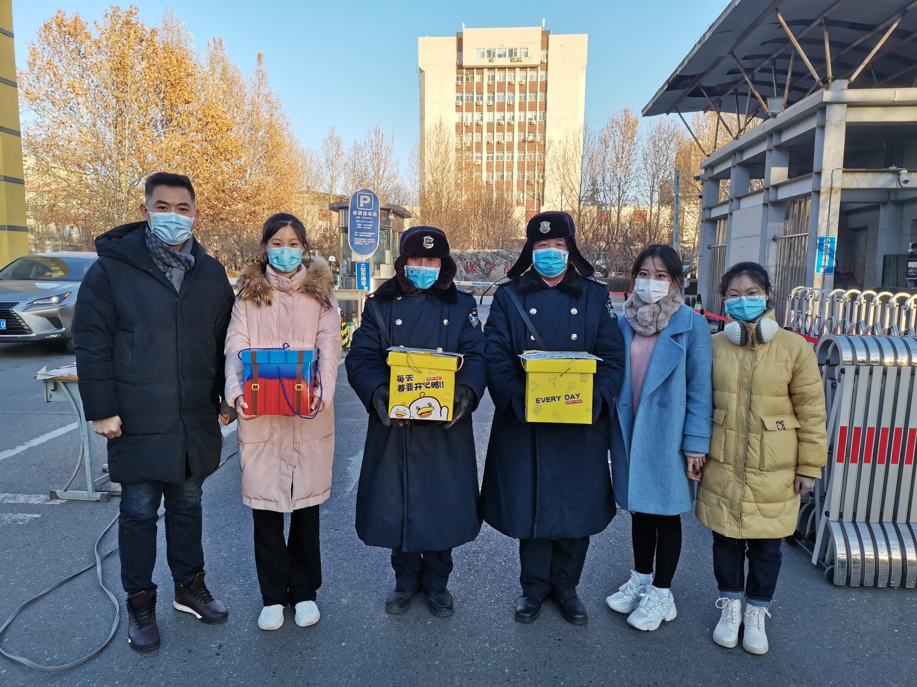 同学代表前往保安值班岗,看望了正在执勤的安保人员,“大家辛苦了!”“谢谢你们为我们的安全保驾护航!”“新年快乐!”同学们热情送上新年大礼包,为保安小哥哥们贴上俏皮可爱的口罩贴纸,欢声笑语间,凛冽的冬风似乎也温柔了许多。