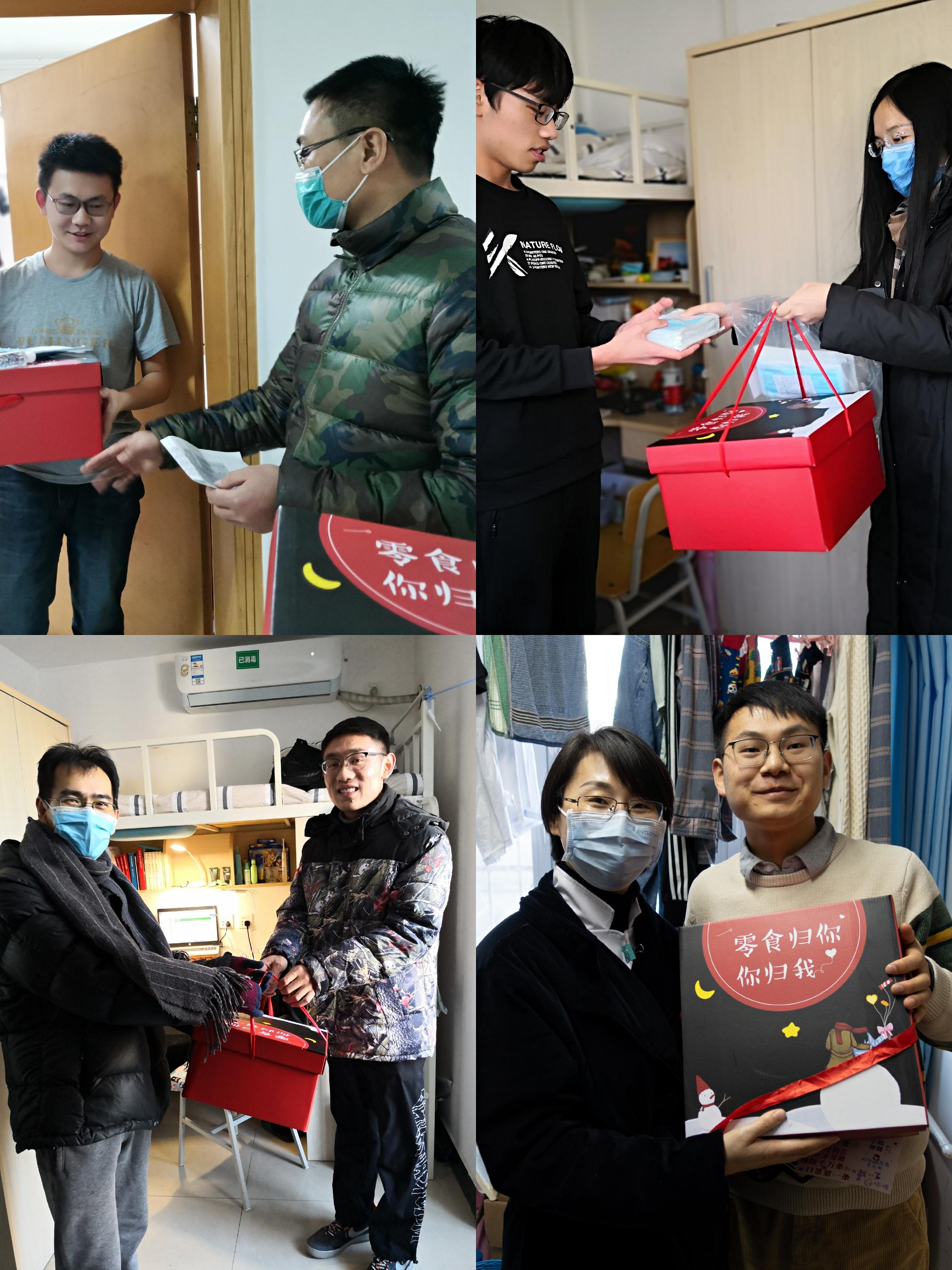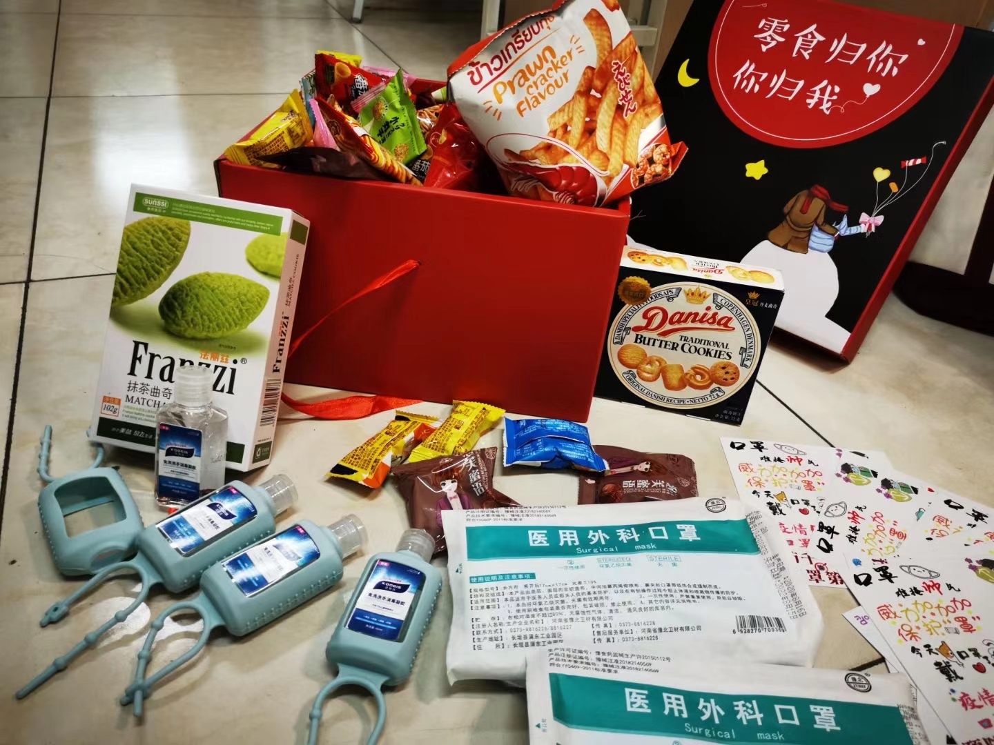 手消毒凝胶、口罩、口罩伴侣——精美贴纸、丰富的零食大礼包……老师们精心挑选的礼物既为同学们的健康保驾护航,又为同学们带来了惊喜。大家纷纷感叹“老师们好贴心!”“太幸福了!”“礼物好丰盛啊!”“冬季最寒冷的三天收到了最温暖的祝福!”更有不少同学拍照发朋友圈,分享此刻的感动与快乐。
