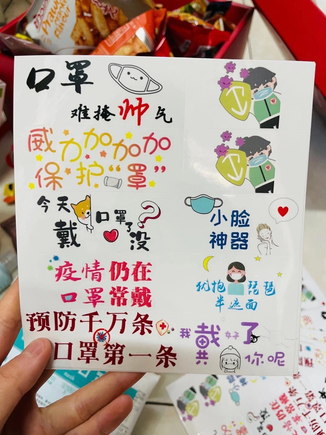 礼物中充满创意的口罩贴纸引得大家称赞连连,贴纸上的“犹抱琵琶半遮面”“预防千万条,口罩第一条”“小脸神器”等标语趣味十足,在鼓励大家戴口罩的同时也增添了一份可爱活泼的气息。