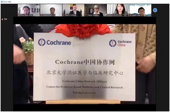 启动仪式上,由Cochrane中国协作网的联席主席周柏珍(香港中文大学医学院)、胡雁(复旦大学护理学院)、靳英辉(武汉大学中南医院)三位教授共同主持,在Cochrane首席执行官Mark Wilson和Cochrane理事会联席主席Tracey Howe等专家的共同见证下,举行了9家Cochrane中国协作网的成员单位的在线揭牌仪式。