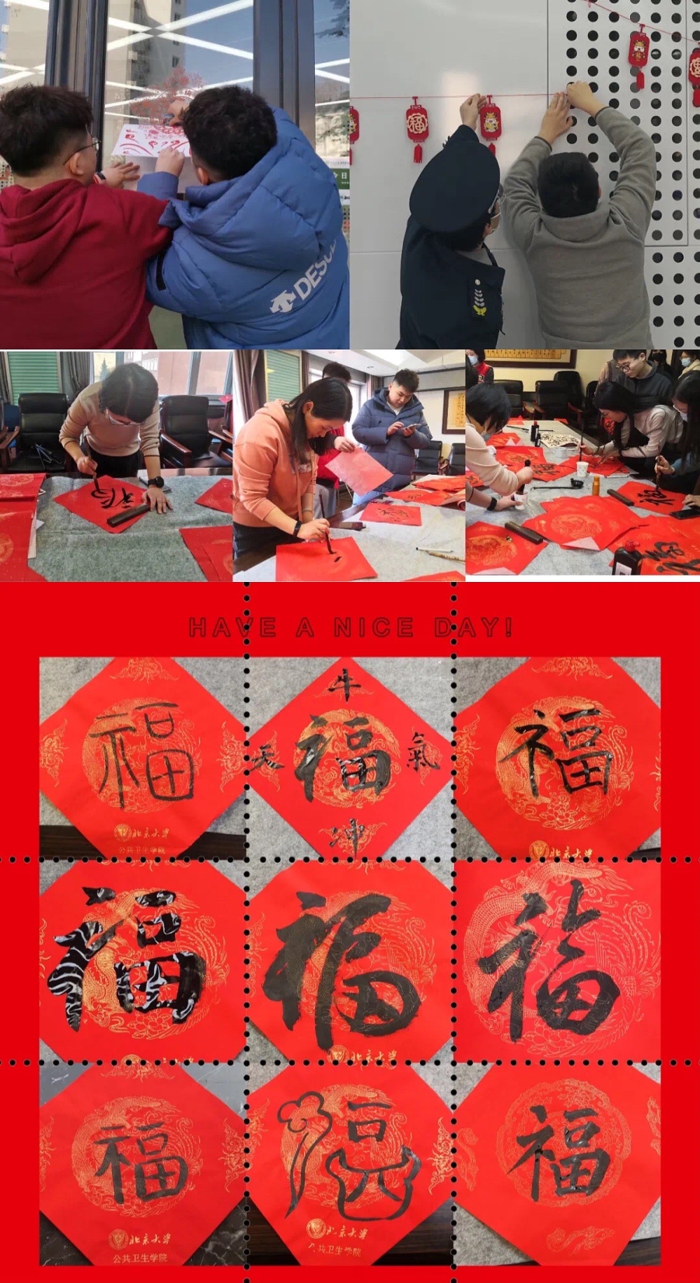 2月9日,正值农历腊月二十八,学院留校的老师和同学们共同书写春联,师生同庆,共迎辛丑牛年春节的到来。随后老师和同学们一起在大厅贴上窗花,为公卫楼添加了不少春节色彩。
