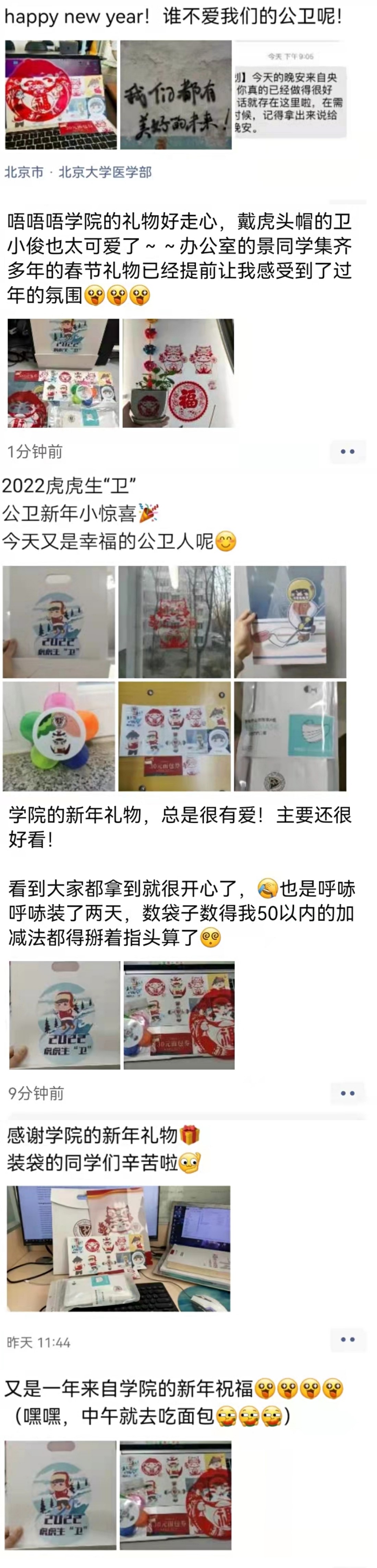 元旦来临时,也是同学们奋战考试月,为一年的学习和工作递交答卷的时期。350vip浦京集团官网的老师们时刻牵挂着同学们的学习和生活,特别准备了丰厚的新年惊喜,为同学们紧张的备考生活注入温暖的能量。12月27日-30日,学院党政领导、各年级第二班主任和专业班主任、学办和团委的老师们先后前往350vip浦京集团官网本科生学生公寓、海淀医院、医学部学生公寓、研究生办公室看望350vip浦京集团官网全体本研学生。老师们手提“虎虎生‘卫’”礼品袋,温暖的笑容驱散了北京冬天的寒冷。一声声殷殷嘱咐,一句句暖心问候,寄托着老师对同学们学习、工作、生活的关爱。同学们为礼物的丰富和精美感到惊喜,他们在朋友圈开心地晒出这些可爱的瞬间,表达自己的感动和欣喜,以及对新年的祝福和期待。