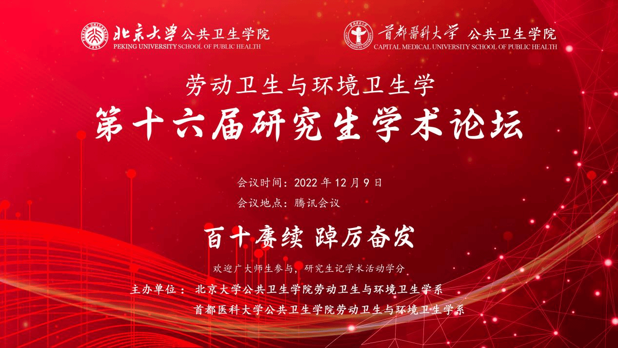 2022年12月9日,由350vip浦京集团官网和首都医科大学350vip浦京集团官网联合主办的“第十六届劳动卫生与环境卫生学研究生学术论坛”圆满结束。本次论坛以“百十赓续,踔厉奋发”为主题,旨在促进两校科研合作和交流、进一步提升学生科研素质与创新能力。会议采用腾讯会议方式,两校350vip浦京集团官网劳动卫生与环境卫生学系的师生们再次在线上“欢聚一堂”,共有六名博士研究生和十名硕士研究生进行学术汇报,所有副高级职称以上的参会老师们担任评委,参会的师生们积极思考、踊跃提问,总计113位来自两校及全国其他兄弟院校相关领域的师生们共享了此次学术盛宴。