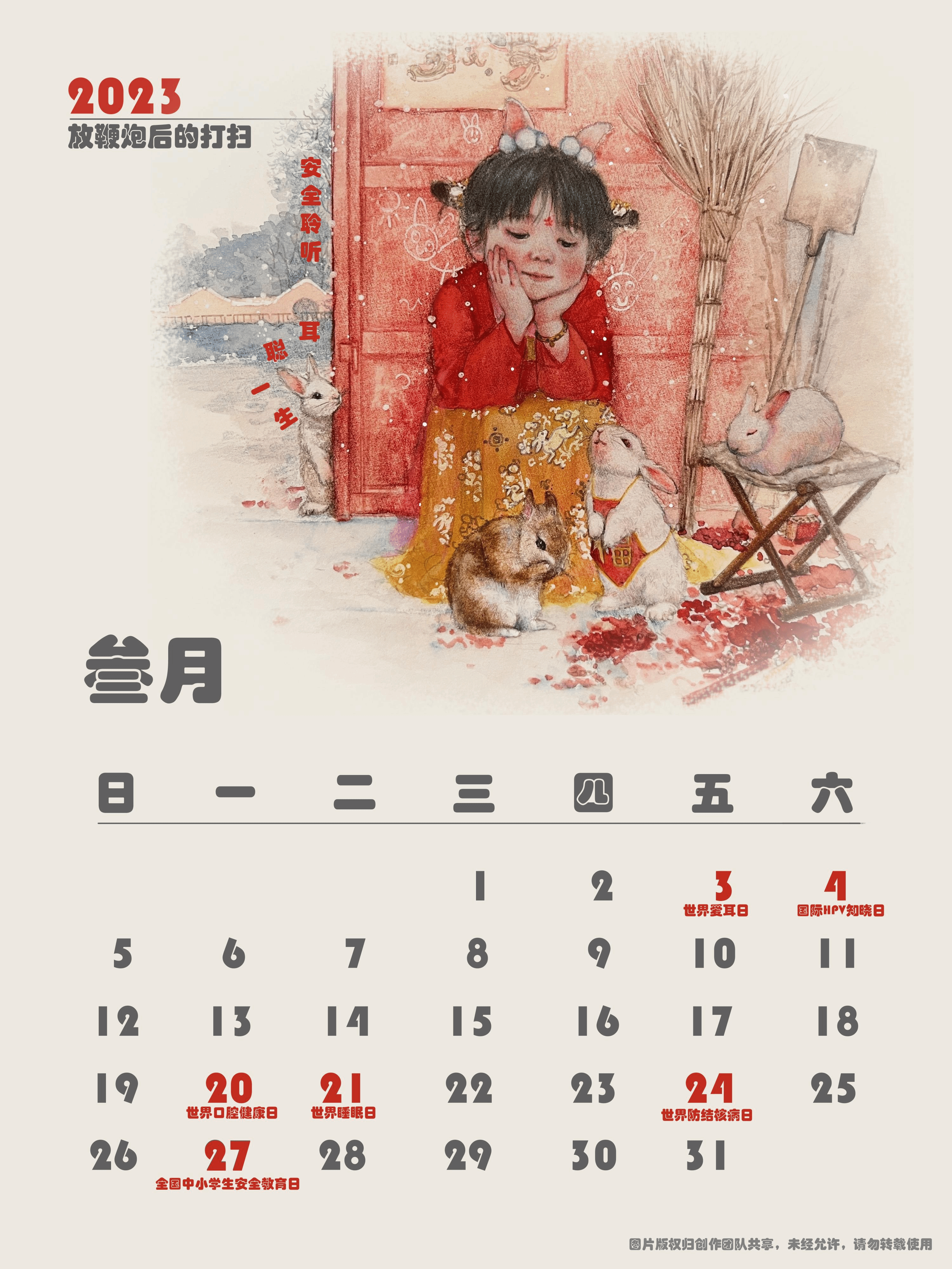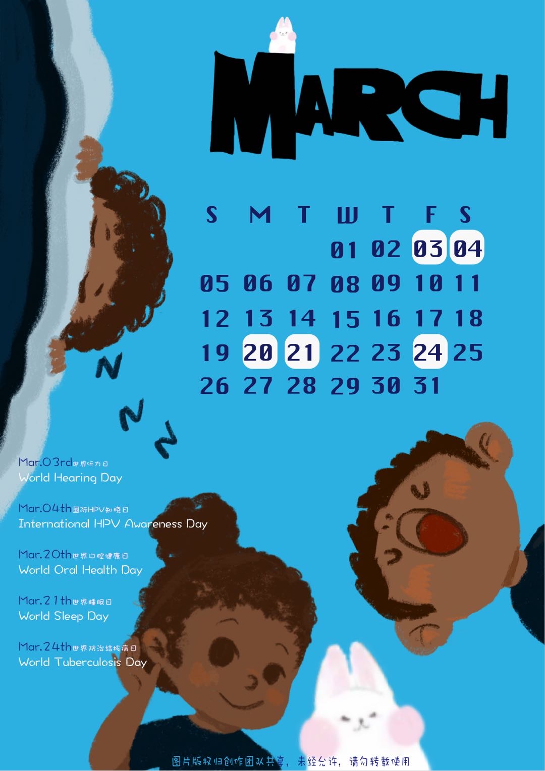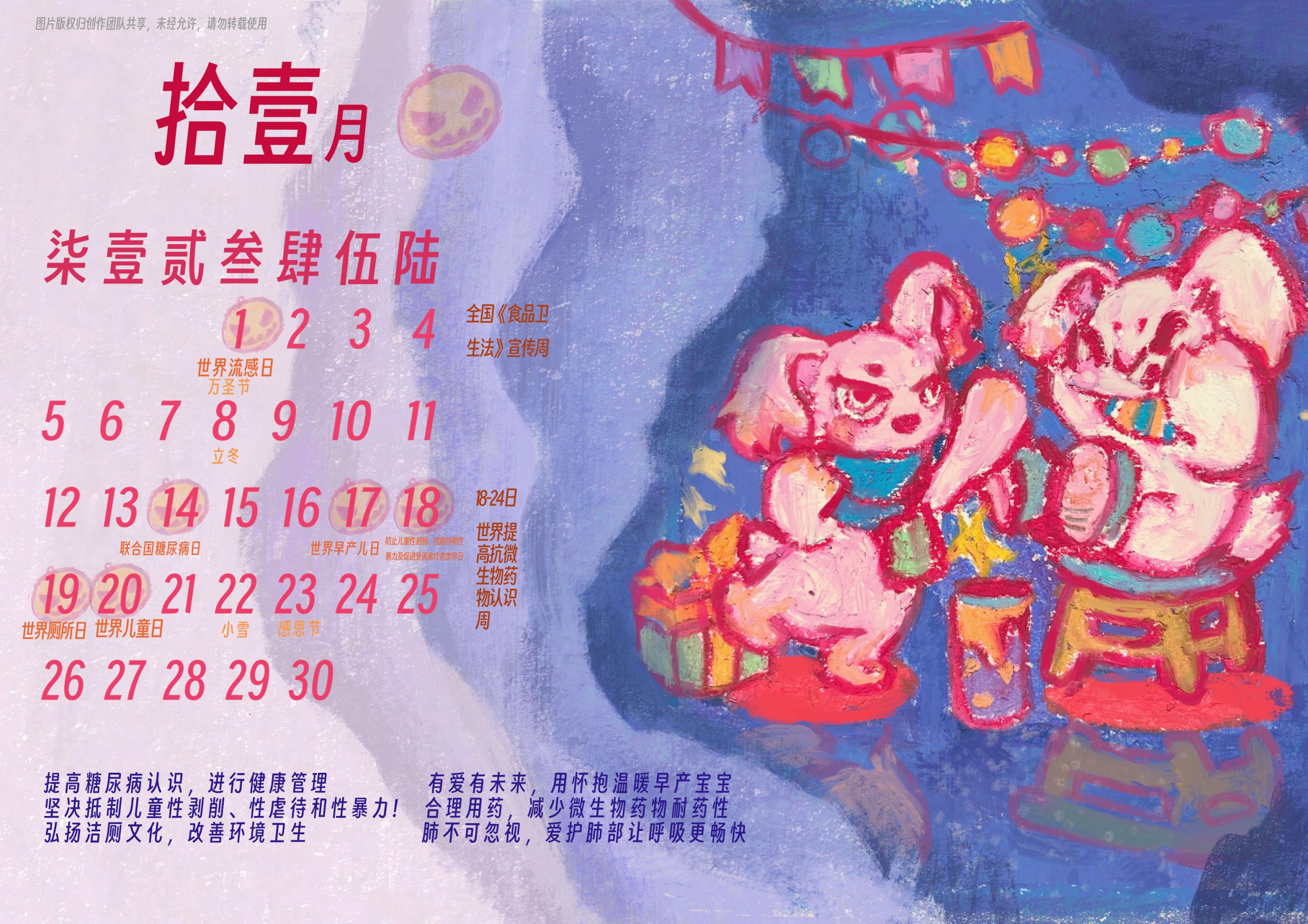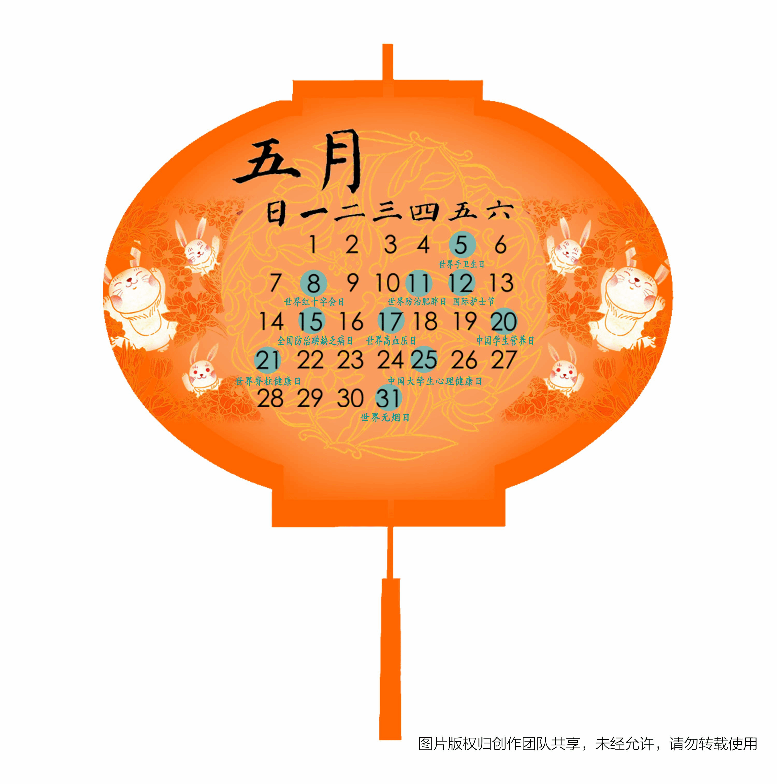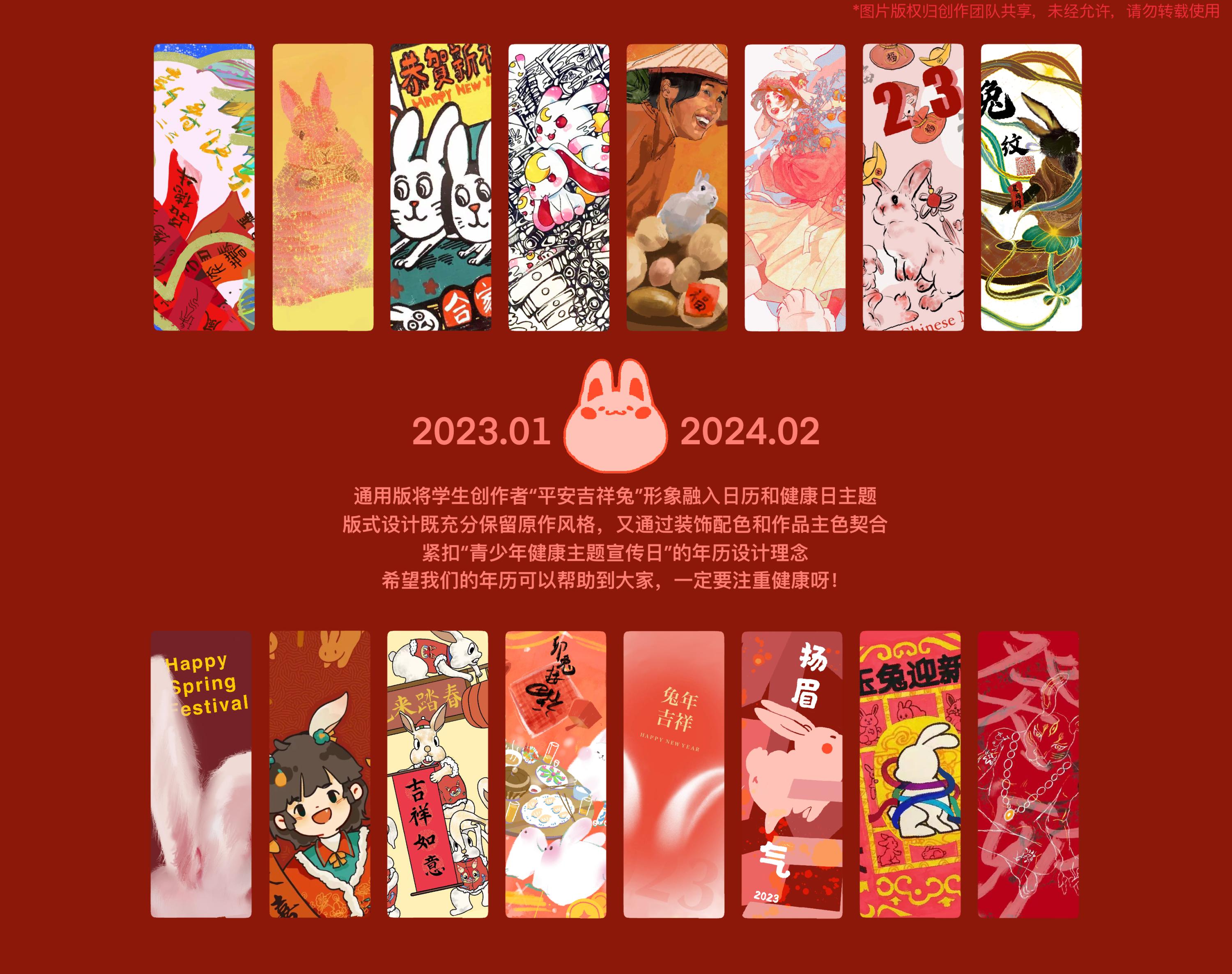 教席统筹指导,跨校融合创新。新春佳节期间,在联合国教科文组织全球健康与教育教席(350vip浦京集团官网)倡导和策划组织下,来自350vip浦京集团官网、中央美术学院和中国传媒大学的60余名师生联袂创作设计,以“平安吉祥兔”形象创作为基础,融合日历和健康元素,挑选出63个健康主题日,并提炼青少年健康主题日宣传语,创作了一组“青少年健康主题日历”。