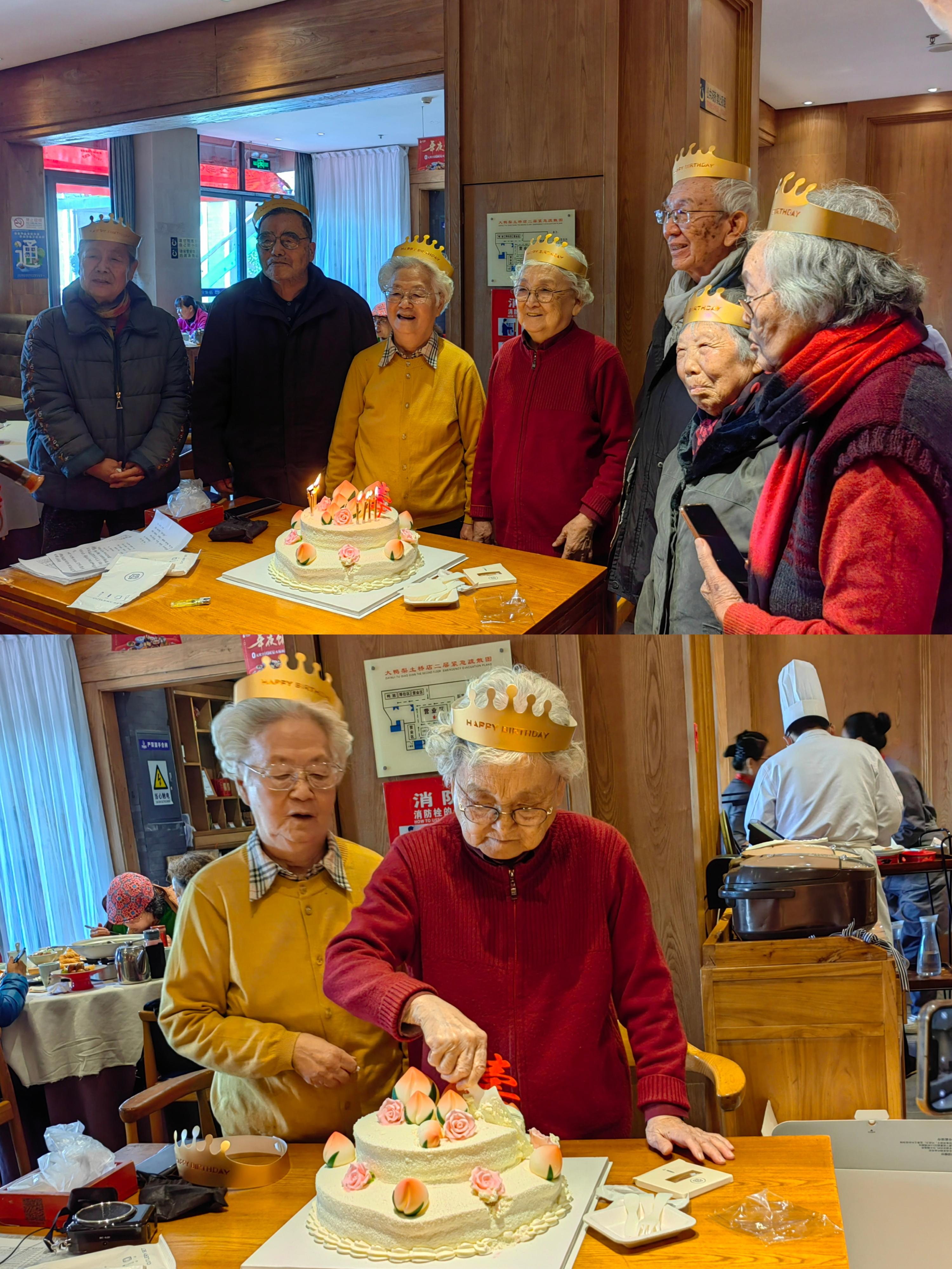 午餐会上,院党委副书记苏鸿老师代表学院为老教师们送去了问候,表示这是疫情之后学院组织大家第一次集体外出,感谢大家对学院发展的关心,感谢他们为学院的发展建设、人才培养等各方面所付出的辛勤劳动,并祝愿老教师们身体健康。为表达对老教师们的敬意,此次活动安排了一个特殊环节,就是为年龄超过80岁、进入朝枚之年的7位参加本次活动的老教师集体过生日,老教师们头戴生日帽,全体人员集体唱起生日歌,为他们送上了深深的祝福,沈惠麒、唐仪两位老师为大家切开蛋糕,分享着各自的喜悦和感动。