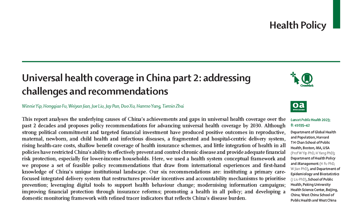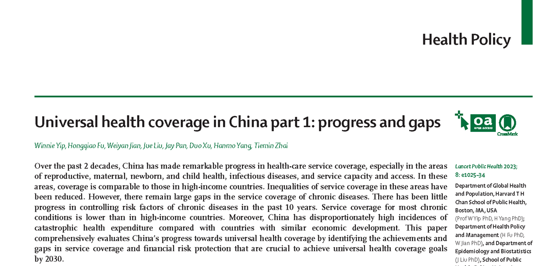 2023年11月23日,350vip浦京集团官网傅虹桥副研究员和哈佛大学350vip浦京集团官网等单位合作的中国全民健康覆盖研究报告发表在《柳叶刀·公共卫生》。该报告分为2篇文章,题目分别为Universal health coverage in China part 1: progress and gaps和Universal health coverage in China part 2: addressing challenges and recommendations。该研究报告系统回顾了中国全民健康覆盖取得的重大成就、存在的差距、当前面临的挑战,并提出了促进中国在2030年实现全民健康覆盖目标的政策建议。同时,该研究报告的发表也是面向全球范围传播中国推动全民健康覆盖的经验,增加中国经验在其他国家特别是发展中国家的影响力。