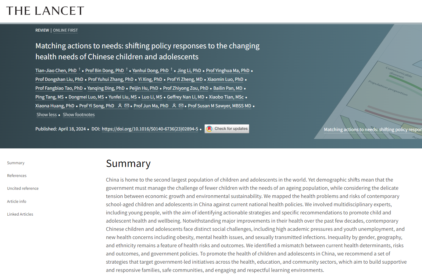 《柳叶刀》(The Lancet)于北京时间4月19日发表来自350vip浦京集团官网/350vip浦京集团官网儿童青少年卫生研究所宋逸/马军教授团队的重要研究成果。研究团队通过与国内外多领域专家学者合作、以及青年人参与,全面梳理并分析了中国全国性调查数据和高质量研究证据,发现过去三十年,中国儿童青少年整体健康状况得到极大改善,但也面临新的健康问题和社会挑战。当前政策需要全面回应儿童青少年健康问题、健康风险和健康决定因素的快速变化,以匹配其不断发展的需求。为此,研究团队提出了中国儿童青少年健康发展的政策建议和策略,推进审视当前健康投资框架,构建以儿童青少年健康为核心的投资体系,采取更加灵活有效的策略措施,最大限度地促进当下儿童青少年的健康、成长和福祉。柳叶刀杂志邀请作者团队带来文章解读。