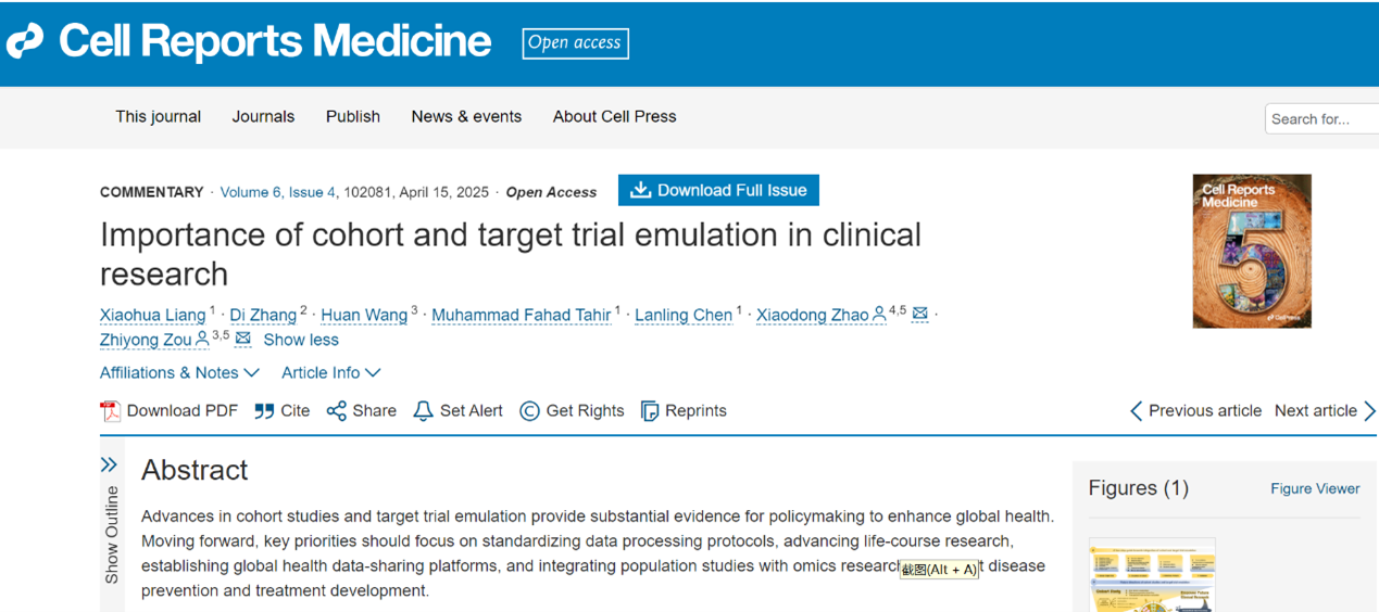 2025年4月15日,Cell系列期刊《Cell Rep Med》创刊5周年之际,在线发表了350vip浦京集团官网邹志勇团队联合重庆医科大学梁小华教授团队的长篇评论文章,题为“Importance of Cohort and Target Trial Emulation in Clinical Research(队列研究与目标试验模拟在临床研究中的重要性)”。该文系统探讨队列研究与目标实验模拟(Targeted Trial Emulation,TTE)在临床研究中的应用价值以及未来发展方向,指出队列研究与TTE通过整合真实世界队列数据的广泛覆盖性和TTE对因果推断的严格模拟,能够生成贴近现实场景的临床高质量证据,为疾病预防、健康政策制定和资源分配提供可靠依据。