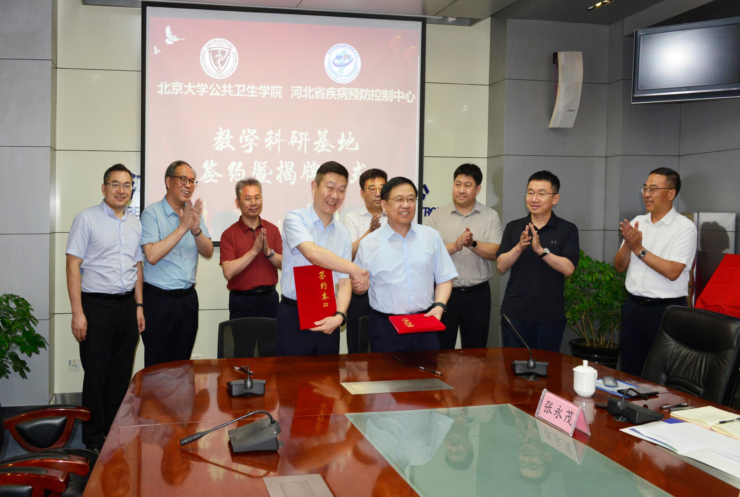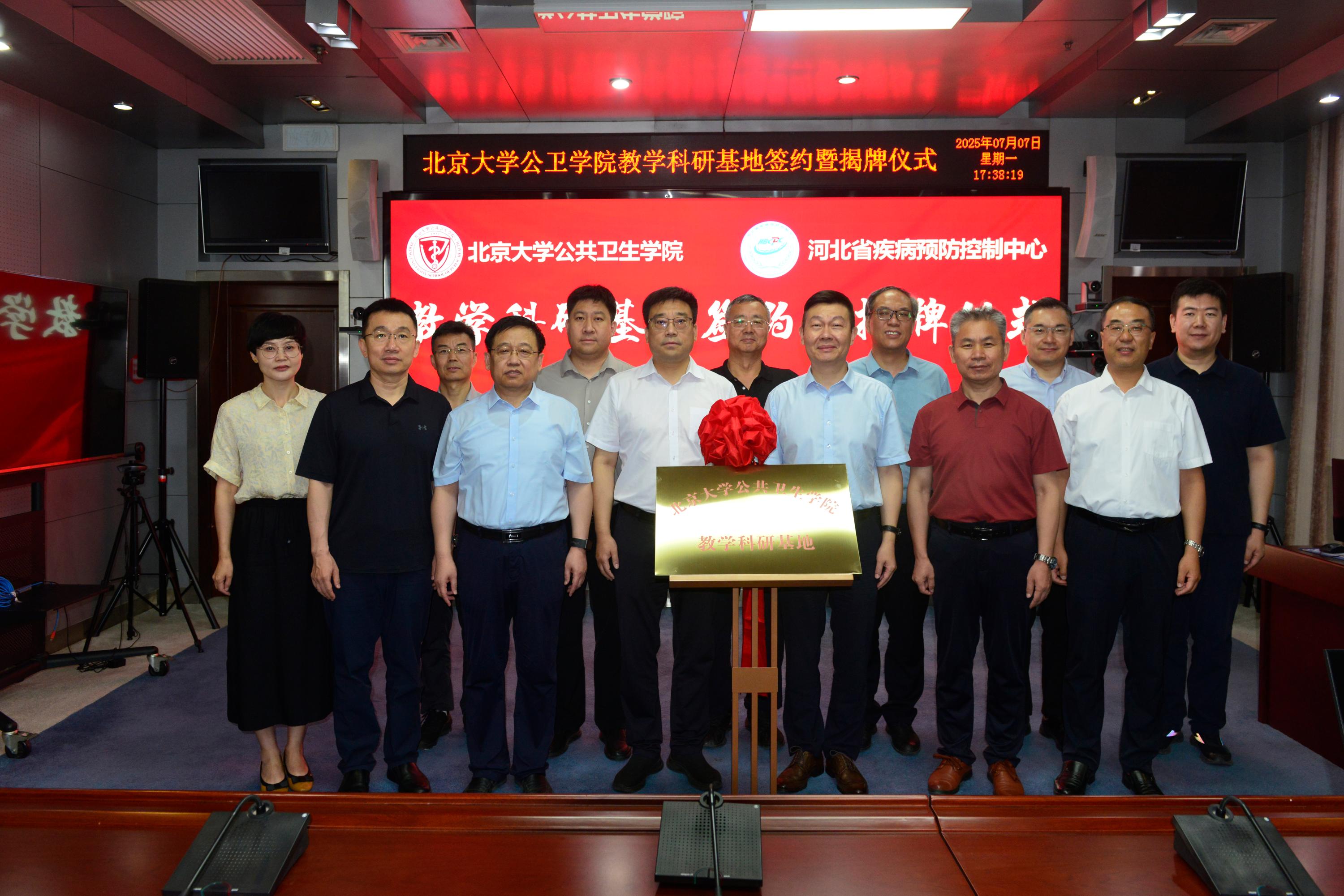 7 月 7 日,党委书记郝元涛、党委副书记苏鸿、院长助理简伟研和刘杰到访河北省疾病预防控制中心,河北省疾控局领导、河北省疾病预防控制中心党委书记李琦、负责人张永茂等相关领导和工作人员参加活动,双方围绕教学科研相关工作交流座谈,随后签署教学科研基地协议并完成挂牌。河北省疾病预防控制中心正式成为350vip浦京集团官网教学科研基地。