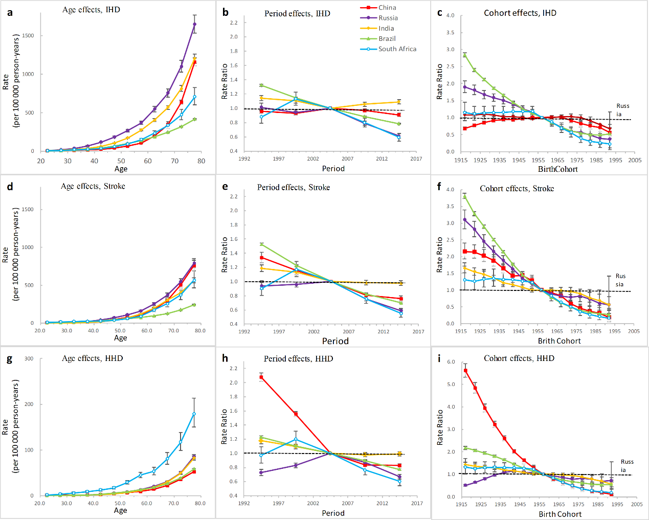 Note: 5a, 5d &5g) Fitted longitudinal age curves of IHD, stroke, or HHD mortality (per 100 000 person-years) and the corresponding 95% CI; 5b, 5e & 5h)The relative risk of each period compared to the reference (year 2002-2006) adjusted for age and non-linear cohort effects and the corresponding 95%CI; 5c, 5f &5i) The relative risk of each cohort compared to the reference (cohort 1955-1959) adjusted for age and non-linear period effects and the corresponding 95%CI (some of were too narrow to show in the Figure). IHD, ischemic heart disease; HHD: hypertensive heart disease; BRICS: Brazil, Russia, India, China and South Africa.