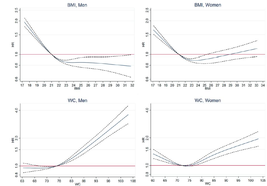 慢阻肺是一种病因复杂的慢性呼吸系统疾病,已成为人群健康的重要威胁。保持适宜体重是健康生活方式的重要组成部分,有助于预防多种慢性病。既往文献表明肥胖与炎症反应及肺功能降低有关,然而肥胖与慢阻肺发病之间的关联尚不明确。腰围是能反映腹部脂肪蓄积的肥胖指标,但关于腰围与慢阻肺的研究有限,而且缺乏中国人群的研究证据。本研究基于中国慢性病前瞻性研究项目(China Kadoorie Biobank, CKB),采用队列研究设计,通过对45万余名研究对象进行10年随访,发现基线腰围与慢阻肺风险呈正向关联,中心型肥胖是慢阻肺的独立危险因素;此外,基线体质指数过低(<18.5kg/m2)也与慢阻肺发病风险升高有关。研究结果提示,保持适宜体重、控制腰围可能有助于预防慢阻肺。该研究受国家自然科学基金和国家重点研发计划的项目资助,通讯作者为350vip浦京集团官网余灿清副教授。