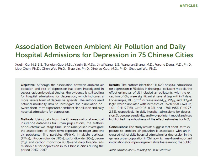 2020年4月21日,350vip浦京集团官网劳动卫生与环境卫生学系郭新彪教授和吴少伟研究员团队在国际高水平期刊《American Journal of Psychiatry》发表有关中国75城市大气污染短期暴露对人群抑郁住院风险影响的分析结果。该研究基于我国城镇职工和城镇居民医保数据库每日住院数据及我国日常环境监测数据,分析了75个城市参保人群短期暴露于主要大气污染物细颗粒物(PM2.5)、可吸入颗粒物(PM10)、臭氧、二氧化氮(NO2)、二氧化硫(SO2)和一氧化碳(CO)与抑郁住院风险的关联(2013-2017)。研究总共纳入超过11万例抑郁住院病例,分析发现多数大气污染物短期内(7天)浓度升高对抑郁住院风险增加有显著影响。如PM2.5、PM10和NO2的两天平均浓度每增加10 μg/m3,抑郁住院风险将分别增加0.52%、0.41%和1.78%。进一步分析发现NO2的效应在不同亚组(南方/北方城市群、男性/女性、19-39岁/40-64岁/65岁及以上各年龄组、城职/城居医保类型)中最为稳定。上述污染物效应不受各城市大气污染物平均浓度、温度、湿度及人均GDP等其他因素差异的影响。不同大气污染物与抑郁住院风险增加的暴露-反应关系在较高污染物浓度范围内(如PM2.5为70-150 μg/m3,PM10为100-200 μg/m3,NO2为40-80 μg/m3)更为明显,提示较高污染浓度对抑郁住院风险增加的影响更显著。上述研究结果对于指导预防大气污染对公众心理健康的不良影响有潜在重要意义。