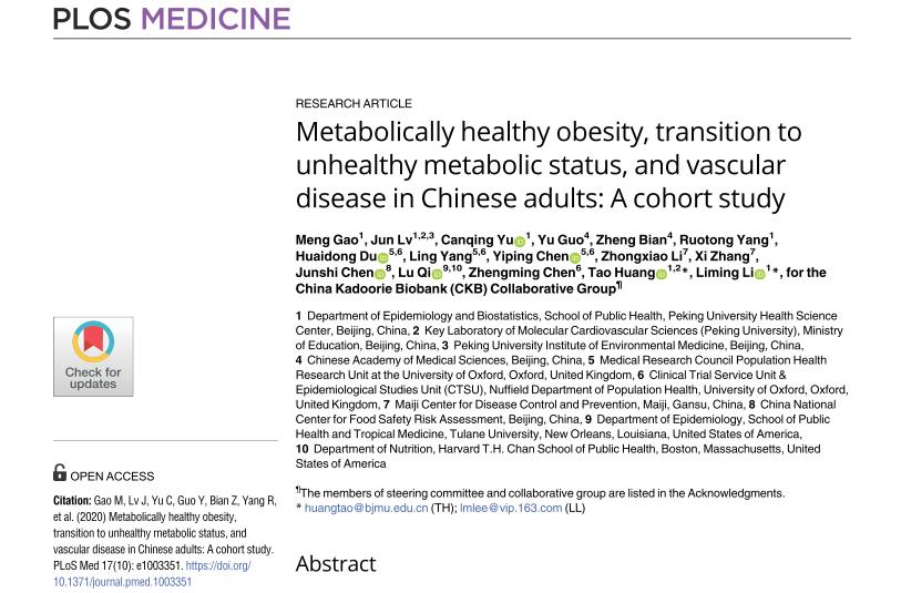 2020年10月30日,350vip浦京集团官网流行病与卫生统计学系李立明教授团队在《PLOS Medicine》上发表了中国慢性病前瞻性队列(CKB)的最新研究成果“Metabolically healthy obesity, transition to unhealthy metabolic status, and vascular disease in Chinese adults: A cohort study”。