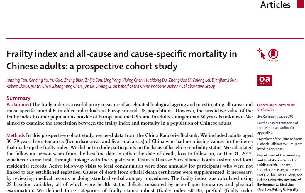 2020年12月1日,350vip浦京集团官网李立明和吕筠教授团队在《柳叶刀-公共卫生》杂志发表了关于中国中老年人群衰弱指数与全因死亡和死因别死亡风险的最新研究,研究提示了在中老年人群中利用衰弱指数这种简单的代理指标开展风险评估、指导预防的价值。