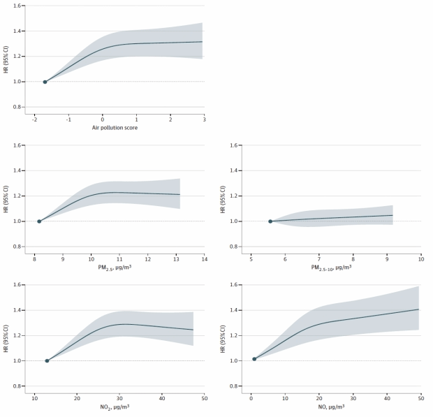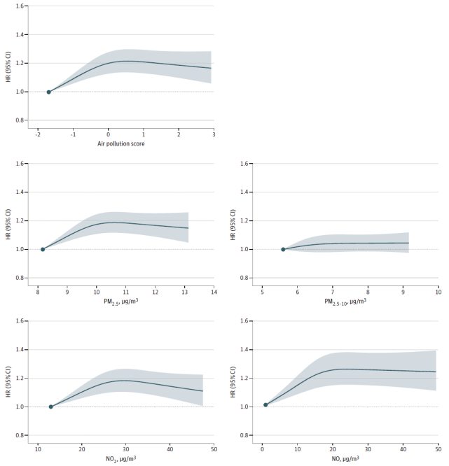 基于上述,本研究在既往研究基础上开展了较低大气污染水平地区大气污染长期暴露对抑郁和焦虑发病风险的影响。研究基于英国生物样本库(UK Biobank)这一大型前瞻性数据库开展。共纳入389,185名研究对象,使用ICD-10编码识别抑郁(F32-F33)和焦虑(F40-F48)的发病,中位随访时间为10.9年,随访期间研究对象中共发生13,131例抑郁和15,835例焦虑。利用土地利用回归模型根据研究对象居住地址估计其住址水平的大气污染暴露情况。研究期间大气污染暴露水平的中位数分别为:PM2.5: 9.9 μg/m3; PM2.5-10: 6.1μg/m3; NO2: 26.0 μg/m3; NO: 15.9 μg/m3,其中PM2.5和NO2浓度水平均符合英国现行的空气质量标准。考虑到大气污染物之间的高相关性,为评估多种大气污染物的联合暴露,使用主成分分析计算大气污染物评分。通过Cox比例风险模型分析了大气污染物长期暴露(包括PM2.5、PM2.5-10、NO2、NO以及大气污染物评分)与抑郁和焦虑发病风险之间的关联,并使用限制性立方样条绘制暴露-反应关系曲线。