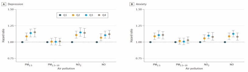 鉴于PM2.5、NO2、NO与抑郁和焦虑发病呈显著关联,使用上述三种污染物通过主成分分析构建大气污染物评分。相对于最低大气污染物评分组(Q1),较高大气污染物评分组(Q2-Q4)抑郁发病的风险比分别为1.08 (95% CI, 1.02-1.14; P = .004), 1.17 (95% CI, 1.11-1.24; P < .001), 1.16 (95% CI, 1.09-1.23; P < .001);焦虑发病的风险比分别为1.09 (95% CI, 1.04-1.14; P < .001), 1.14 (95% CI, 1.08-1.19; P < .001), 1.11 (95% CI, 1.05-1.17; P < .001)。