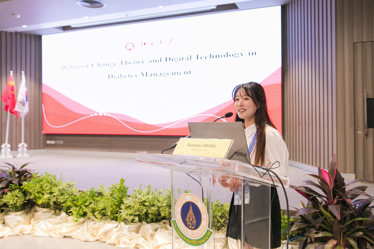 在PhD学生交流环节中,劳动卫生与环境卫生学系黄婧副研究员担任主持人。来自社会医学与健康教育系的博士研究生张晓悦,以“Behavior Change Theory-Based Diabetes Management and Digital Technology Applications”为主题,深入分享了自己在糖尿病健康管理方面的最新研究成果。在报告中,张晓悦同学详细阐述了数智技术在糖尿病管理中的有效性及其应用前景,提出了利用先进技术优化糖尿病患者健康管理的路径,从而提高患者的自我管理能力与疾病控制水平。她指出,参与亚洲校园计划不仅开阔了自己的国际视野,更为其科研工作提供了明确的方向和思路。
