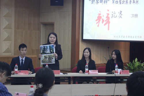 在开场双方队员的自我介绍环节,公卫队别出心裁,结合图片生动地介绍了团队的四位成员,他们分别是(下图由右至左)一辩赵艾,二辩刘璐,三辩张远(队长),四辩武骁飞。