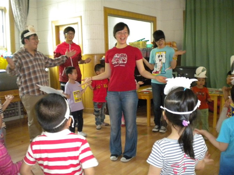 图为许雅君老师代领北医幼儿园小朋友们做游戏