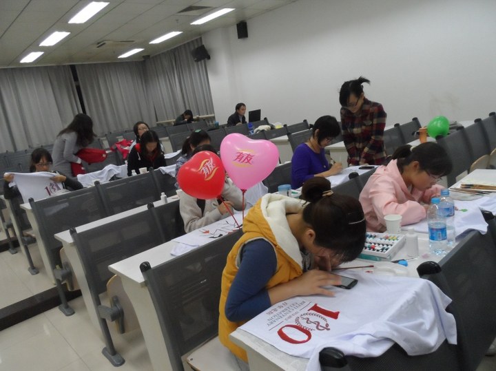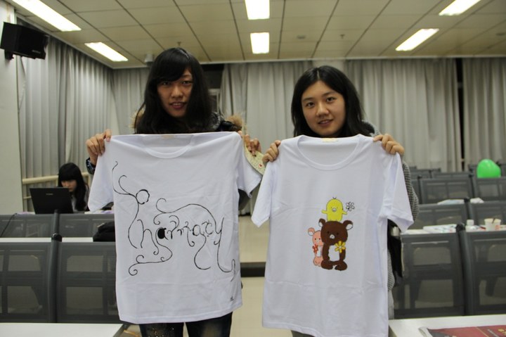 晚上6点半409教室就陆陆续续有同学来到活动现场。7点整,DIY文化衫的活动正式开始。同学们坐满了教室,认真地握着铅笔开始在定制的文化衫上勾勒自己的图案。学生会为同学们提供了丰富的水彩颜料、充足的丙烯颜料和各种型号的笔刷,以及印有北医百年庆典标志制作精良的文化衫等手绘材料。最后,同学们都满意地完成了自己的作品,满载而归。在活动结束后,我们将活动的精彩瞬间上传到了人人网上,将DIY文化衫的欢乐与更多的同学分享。