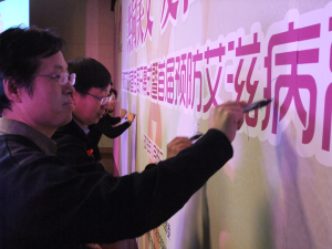 为突出今年预防艾滋病宣传周的主题,公卫学生会还亲手设计了特色LOGO,由李红老师、徐震雷老师、沈鹏老师以及刘小平先生上台为logo揭幕,开幕式达到高潮。