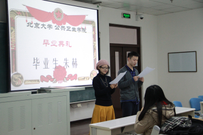 上午九点开始,同学们到达逸夫楼509教室进行“毕业典礼”的准备工作,设计黑板、熟悉流程、排练节目,10点,毫不知情的主角朱赫同学来到教室,一眼看到 PPT投影布上 “毕业典礼”四个大字,恍然大悟,欢送活动正式开始。
