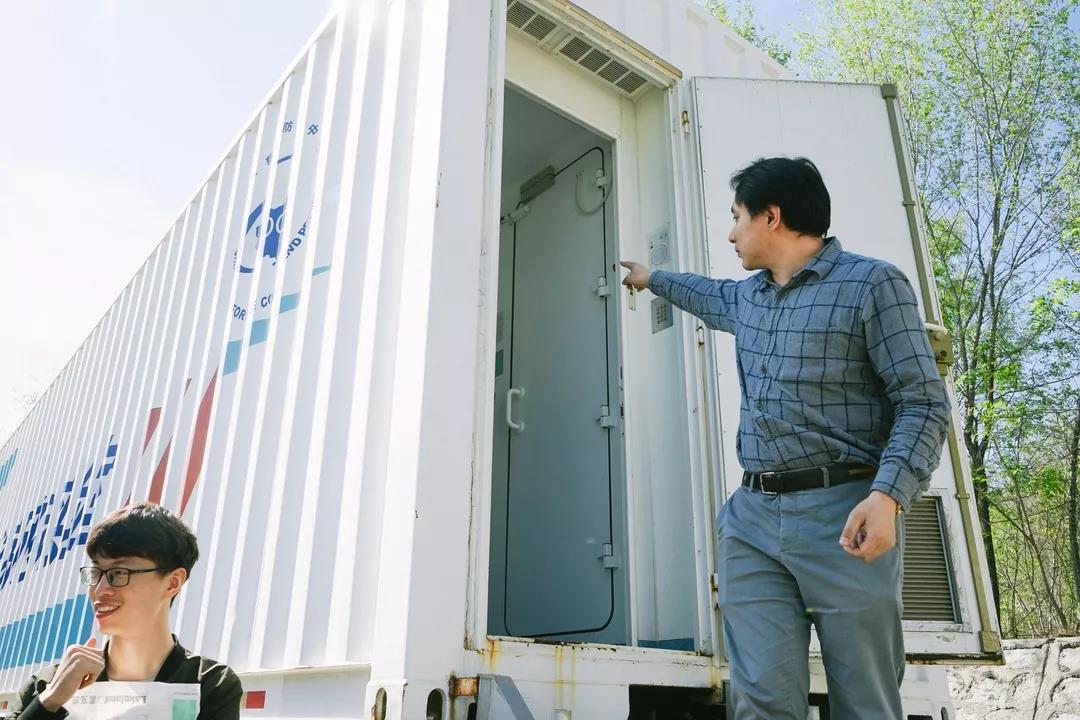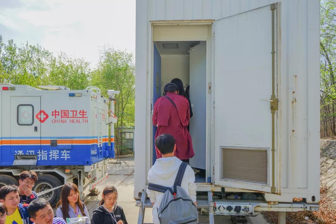 走出会议室,我们跟随老师来到室外,分组进入国家应急队移动生物安全三级实验室。在老师的讲解下,我们知道了现在停在我们面前的这辆移动实验室车,曾在玉树震后防疫工作期间,在高原上服役了将近三年。老师向我们讲述了他在灾后工作的故事,并与我们分享在北大公卫学习的经历。