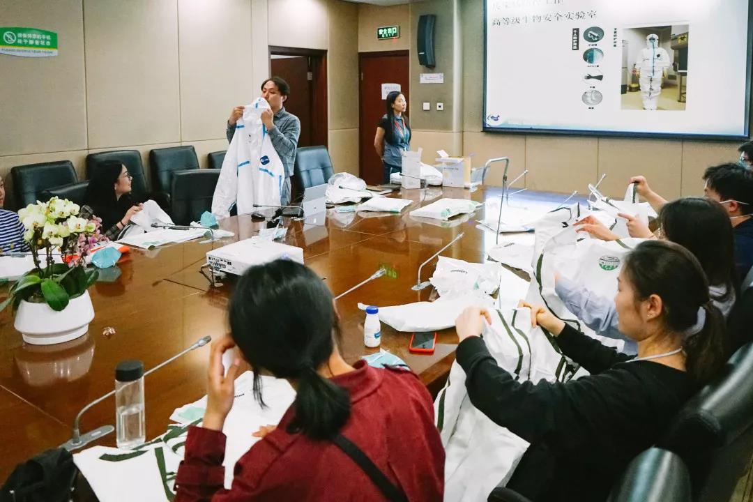 之后,我们来到会议室,详细了解中国疾控的职能和概况。侯雪新老师向我们介绍了传染病所的部门设置以及实验室设计,并拿出P3实验室使用的防护服、口罩和手套给大家体验。最后,老师解答了我们的问题,并提出,希望预防医学的学生更好地培养自己全方位的能力,毕业后能够参加疾病预防控制工作,坚守基层,自我沉淀,成为社会需要的公共卫生人才。
