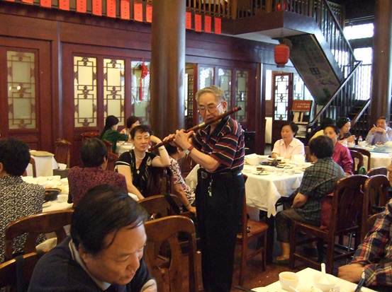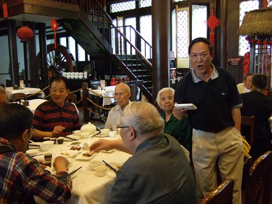 参观完毕,组织人员又带领老干部们到明慧茶院品茶、聊天,大家彼此交流退休后的生活乐趣。午饭期间,老干部们一时兴起,自发表演起节目。有唱歌的、有吹笛子的,给现场增添了无尽的欢笑,大家脸上都暂放了灿烂的笑容。