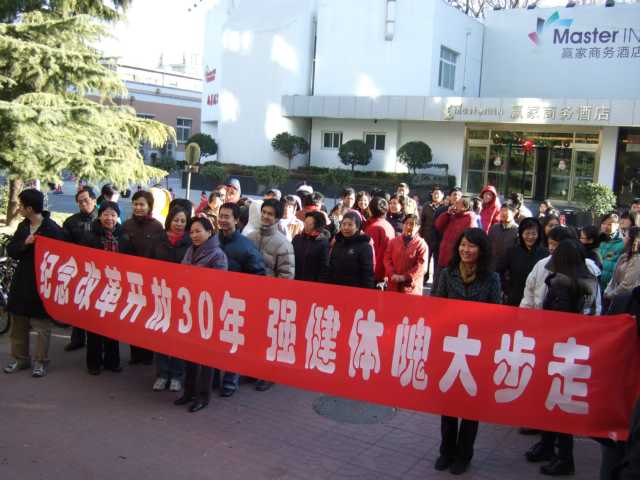 组织了“庆祝改革开放30年,强健体魄大步走”活动。上午10点全院教工和研究生在学院门口集合,由院党委书记王燕教授讲话并宣布活动开始。医学部工会王春虎主席和梁艳老师也加入到活动队伍中来,为大家鼓劲加油。在徐善东主席的一声令下,老师和同学们你追我赶,迈开大步沿着规定线路开始行进。他们有的步伐稳健、有的大步流星,有的跟着导师一路小跑,大家向着一个“既定目标”前进!!!