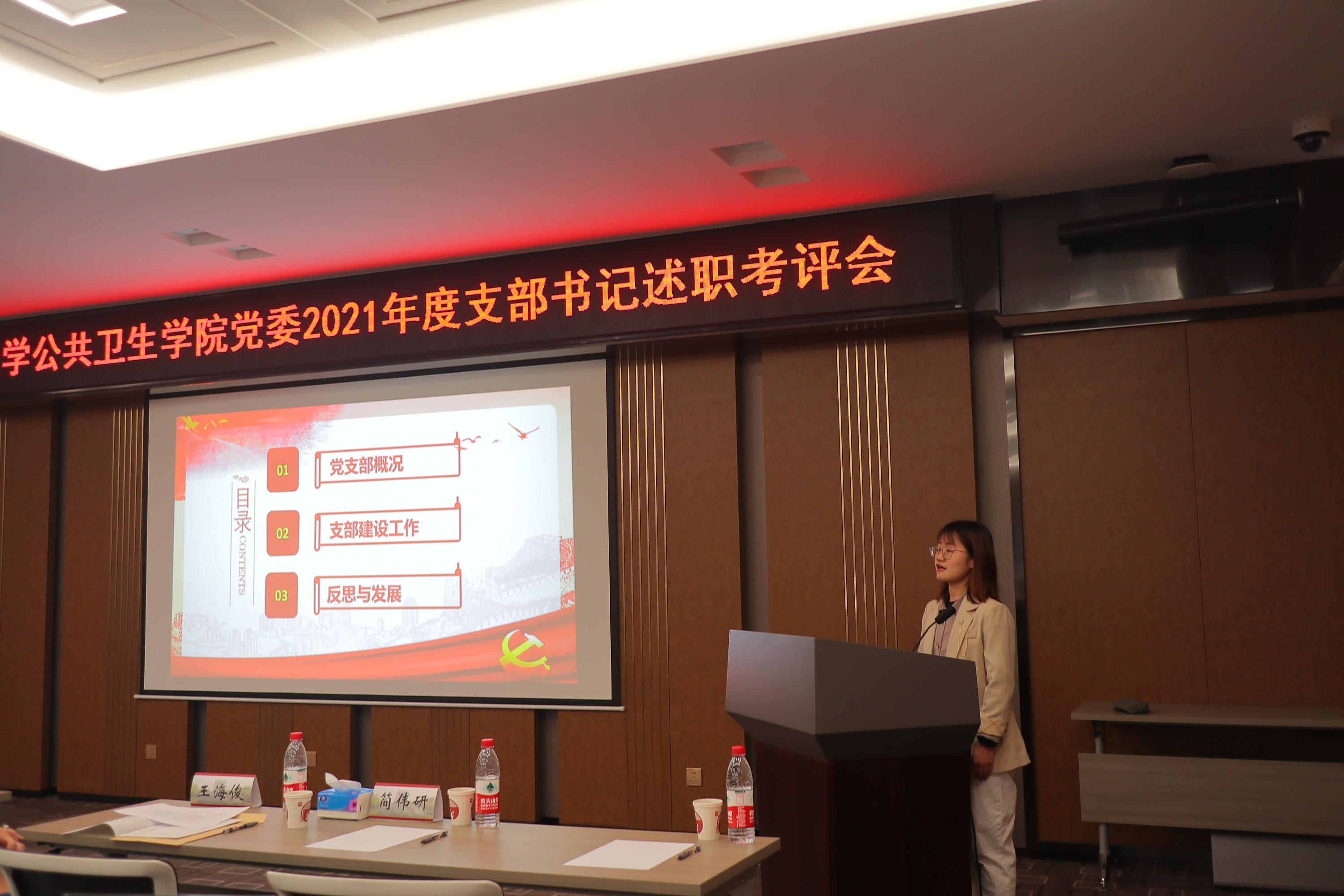 首先,学院党委郝卫东书记向大会报告了学院党委在过去一年的总体工作、发展成绩和未来建设方向。2021年,在350vip浦京集团官网和医学部党委的领导下,学院党委团结带领各支部及全院师生,紧紧围绕立德树人根本任务和建设双一流学科的目标,保方向、管大局、抓落实,发挥监督保障和政治核心作用,取得突出成绩,获评为350vip浦京集团官网先进党组织、350vip浦京集团官网宣传工作“优秀组织工作奖”。郝卫东书记指出,党支部书记述职是350vip浦京集团官网党委的优秀传统,是开拓创新、积极进取、持续夯实基层党建工作的重要手段,应长期坚持办好。今年由学生党支部以口头汇报形式,教职工党支部以书面汇报形式进行述职。