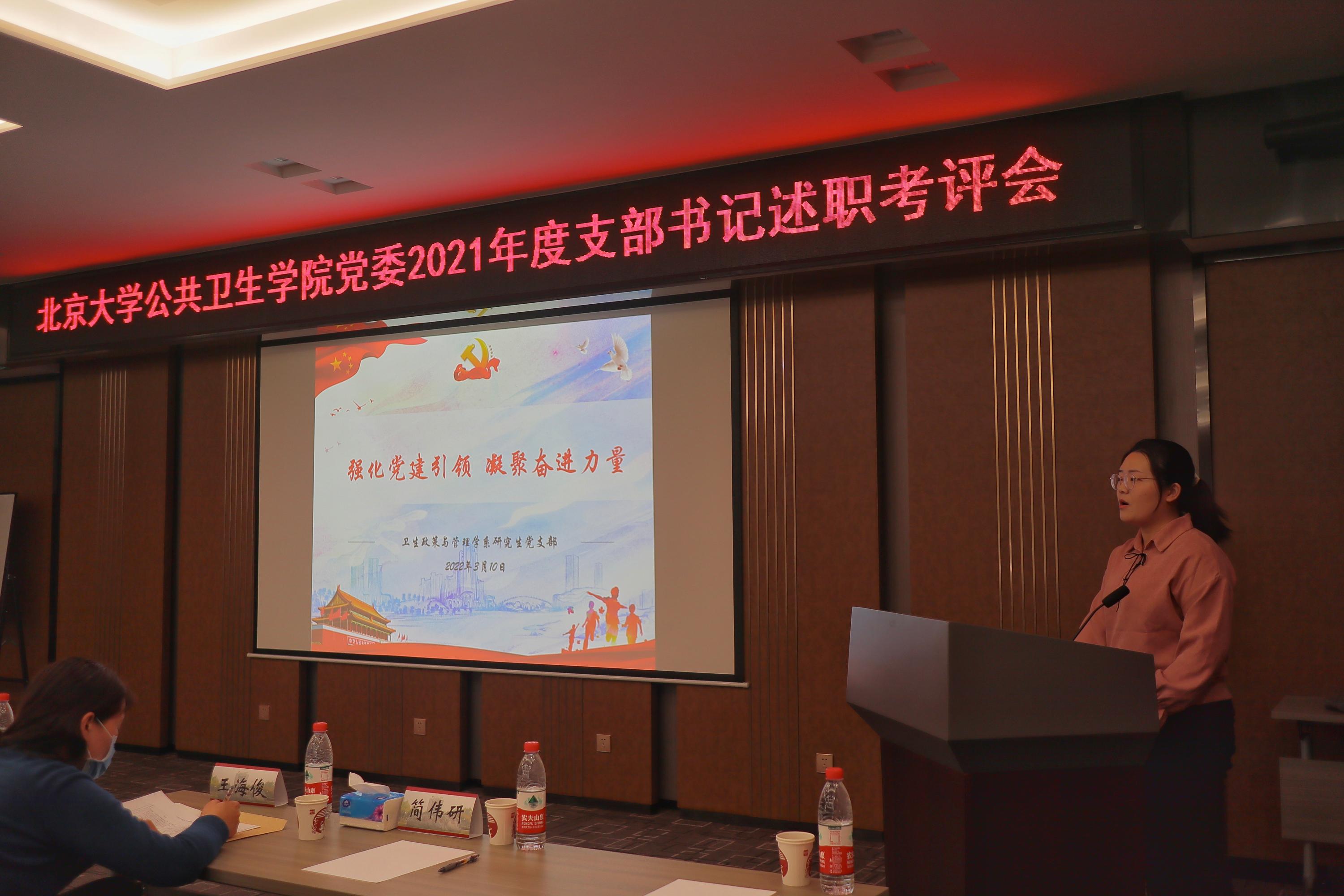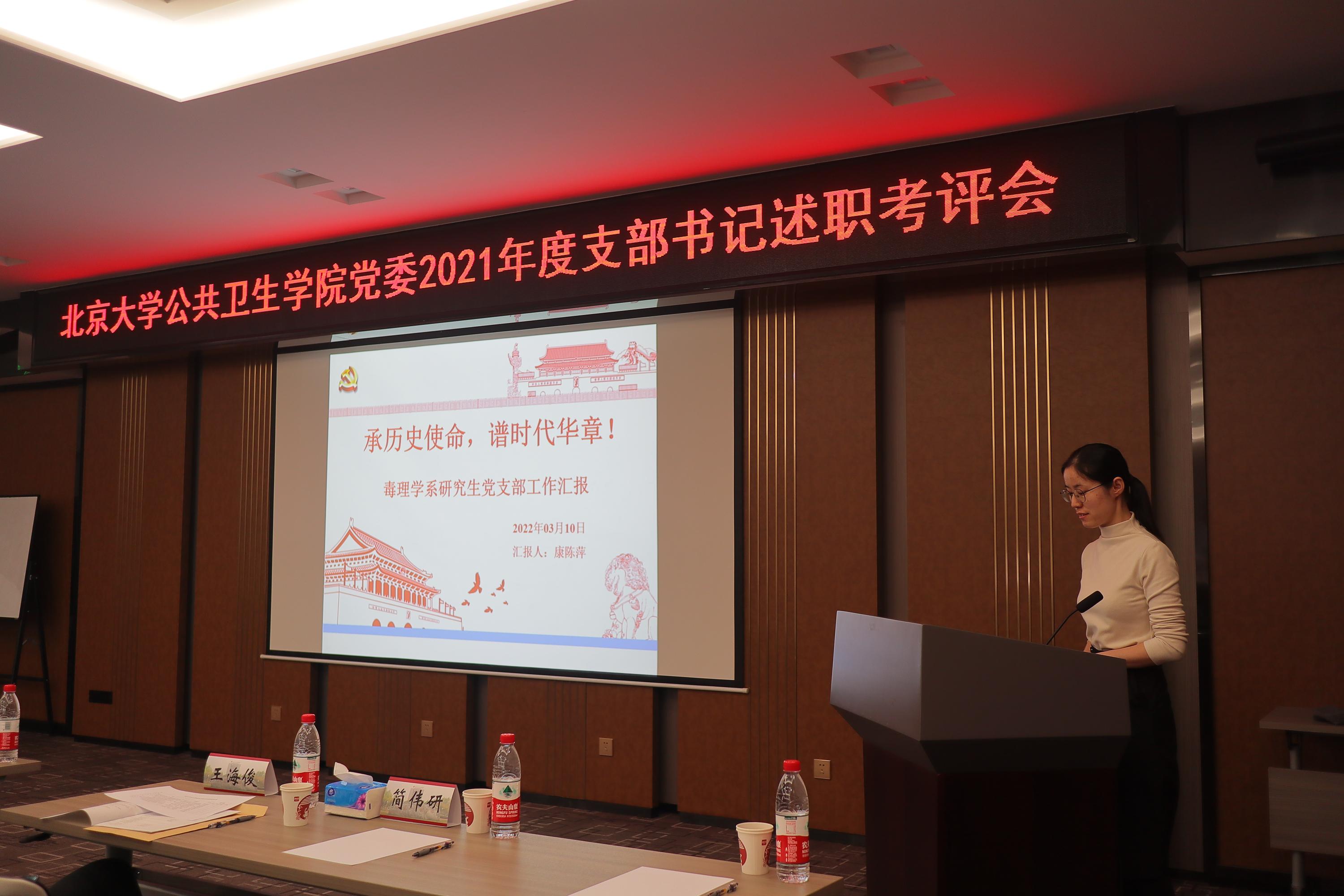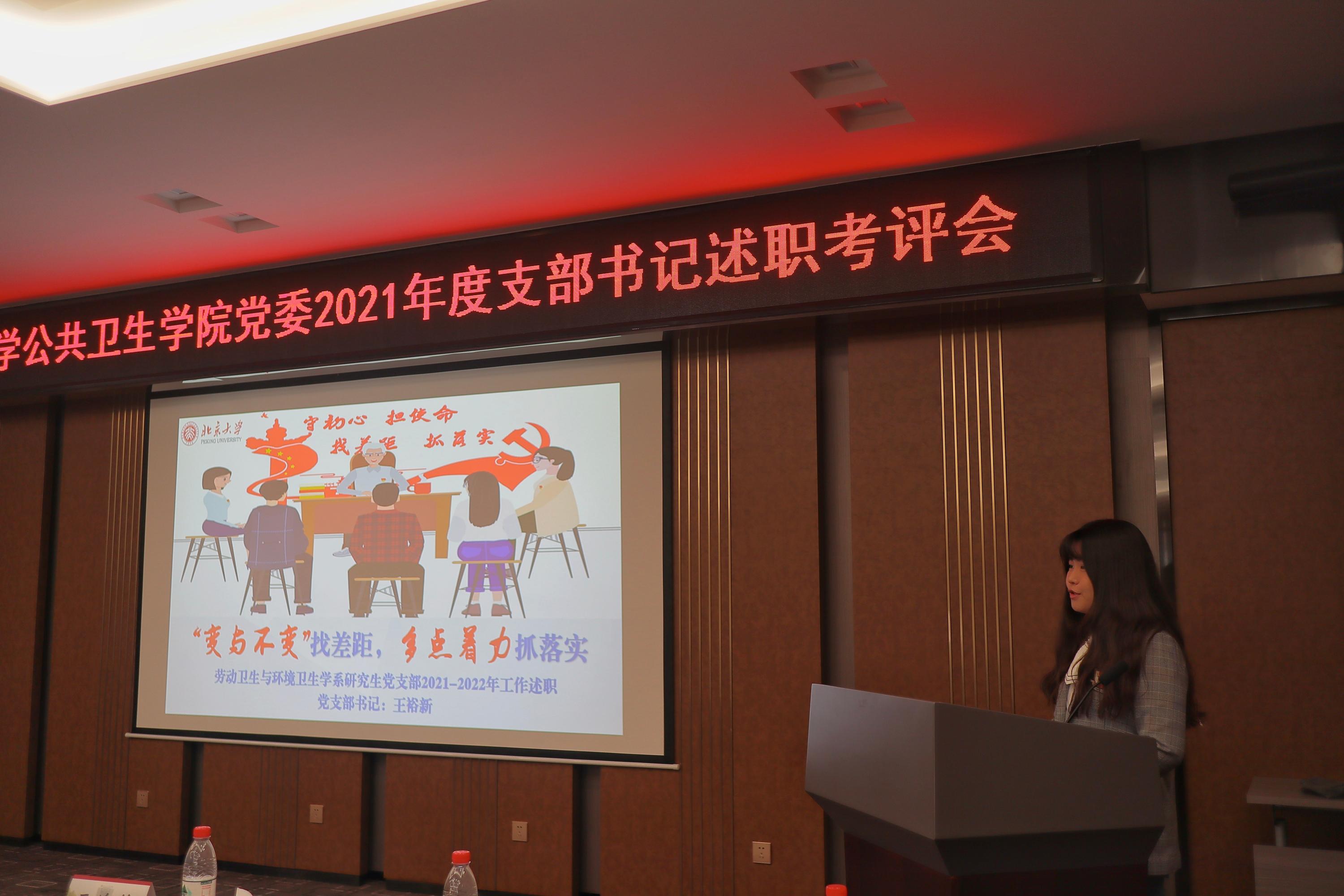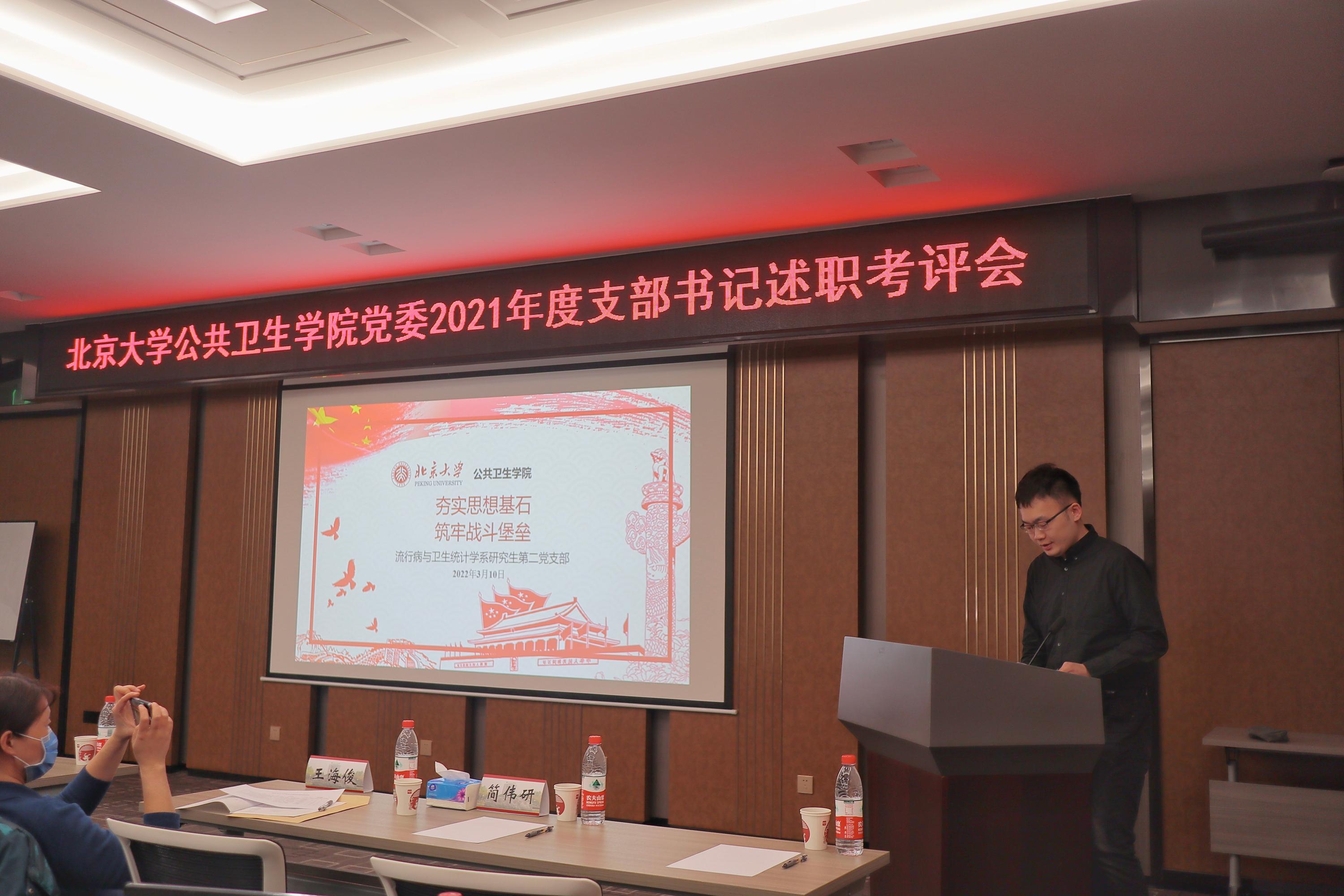 紧接着,各学生党支部书记依次进行口头述职。流行病与卫生统计学系研究生第一党支部书记杨君婷、劳动卫生与环境卫生学系研究生党支部书记王裕新、营养与食品卫生学系研究生党支部书记郭凯威、儿少卫生与妇幼保健学研究生党支部书记贾碧波、毒理学系研究生党支部书记康陈萍、卫生政策与管理学系研究生党支部书记付茜茜、社会医学与健康教育学系研究生党支部书记窦宇琪、流行病与卫生统计学系研究生第二党支部宣传委员唐泽昱(代正在冬残奥会现场服务的支部书记曹梦奇)、全球卫生学系研究生党支部书记马继炎、本科生党支部书记闫温馨先后代表本支部从支部基本情况、建设情况、党员发展和特色活动等方面对支部两年来的工作进行汇报。全体与会人员进行打分评价。
