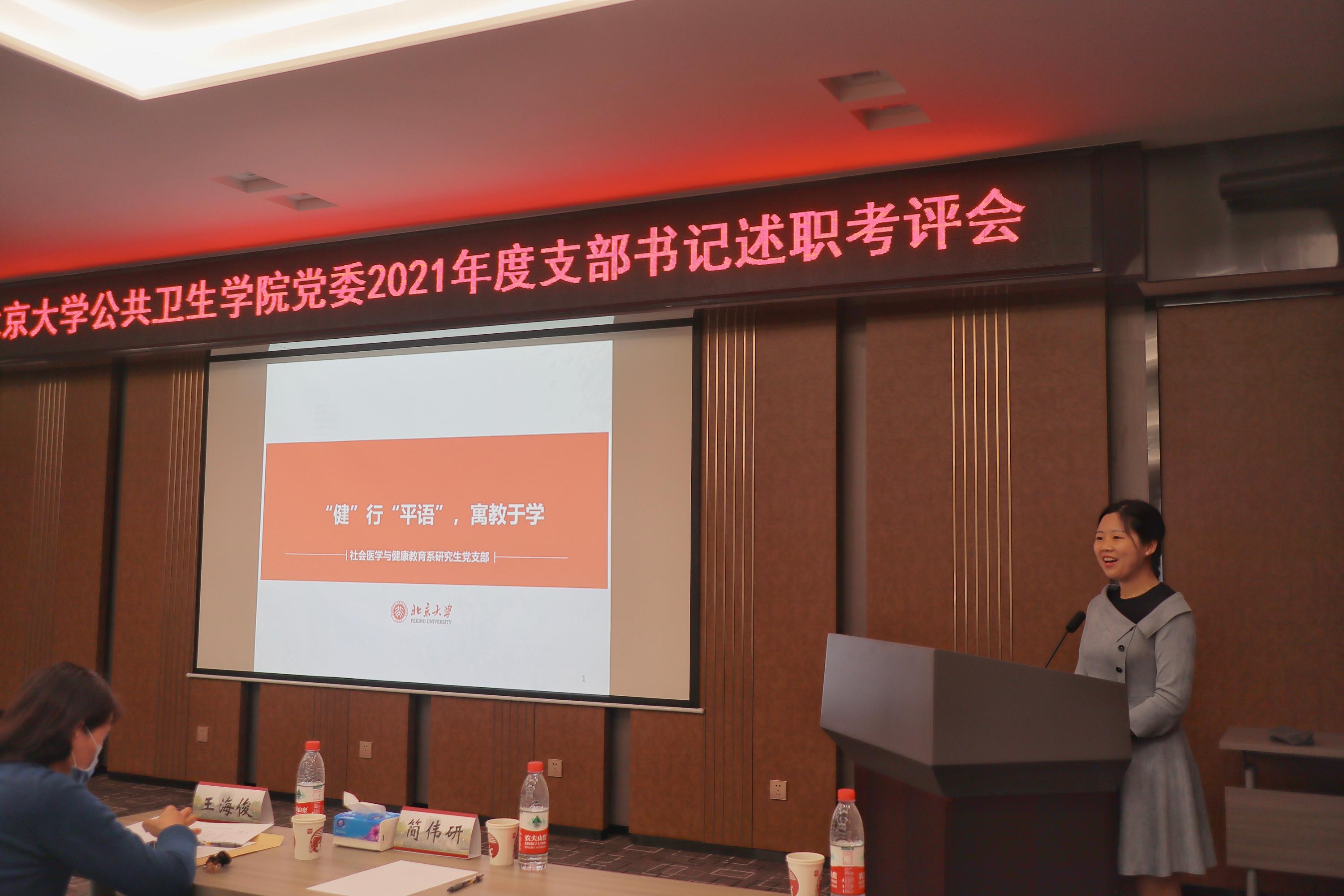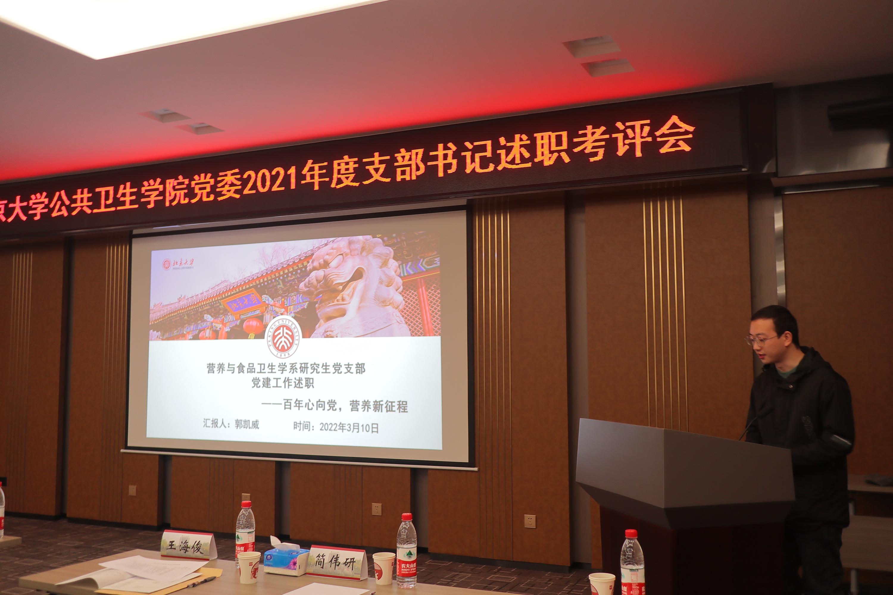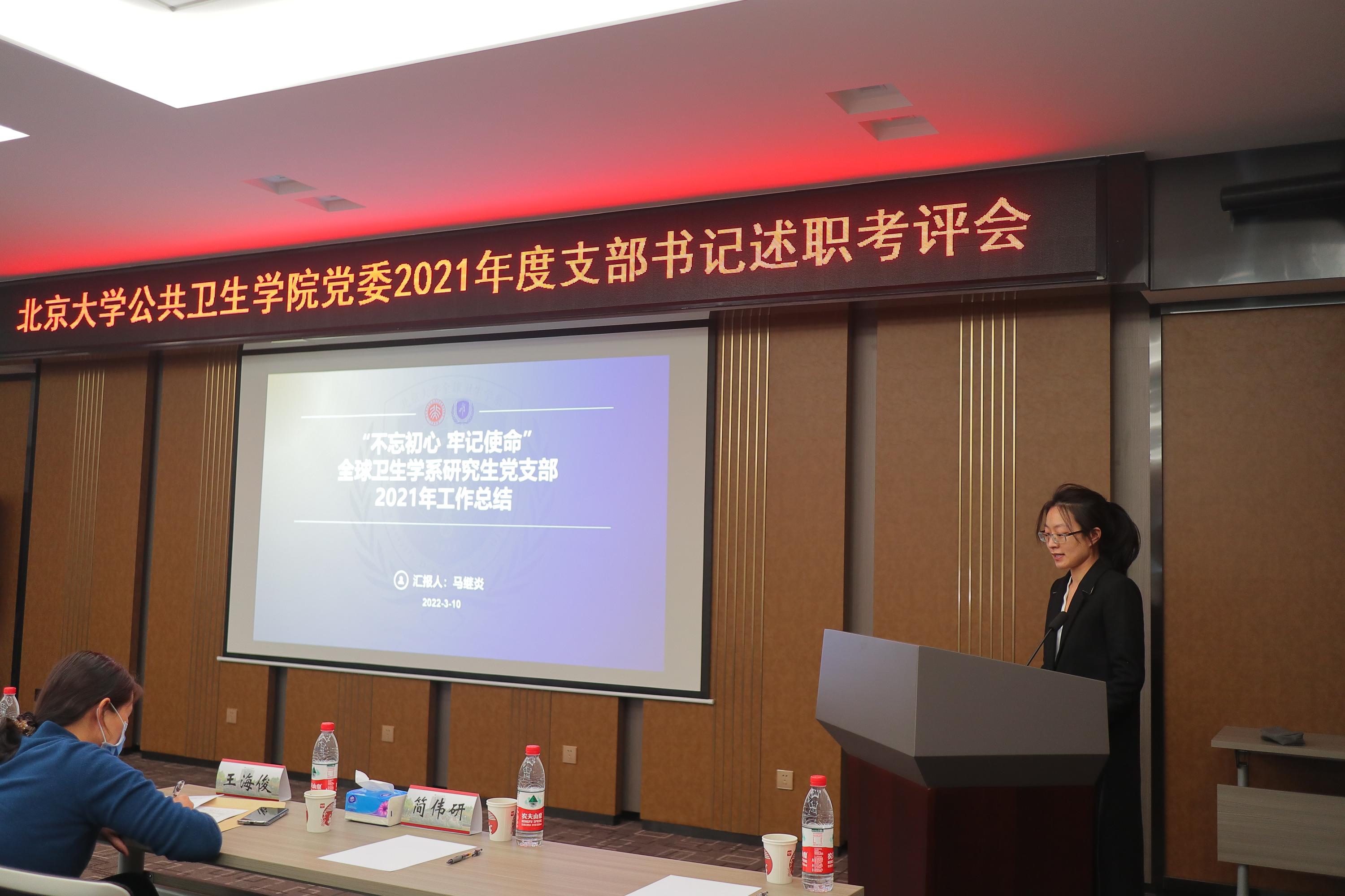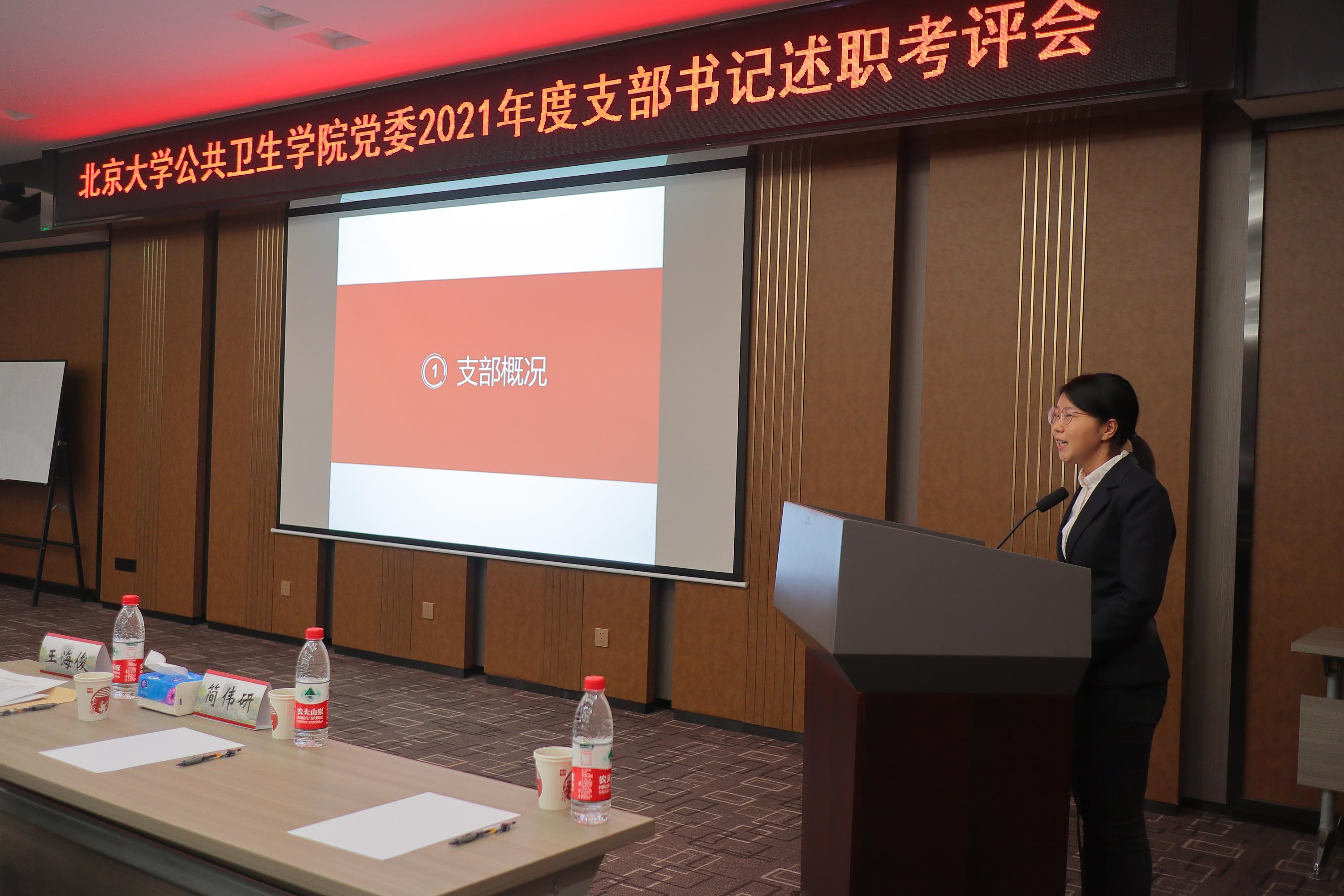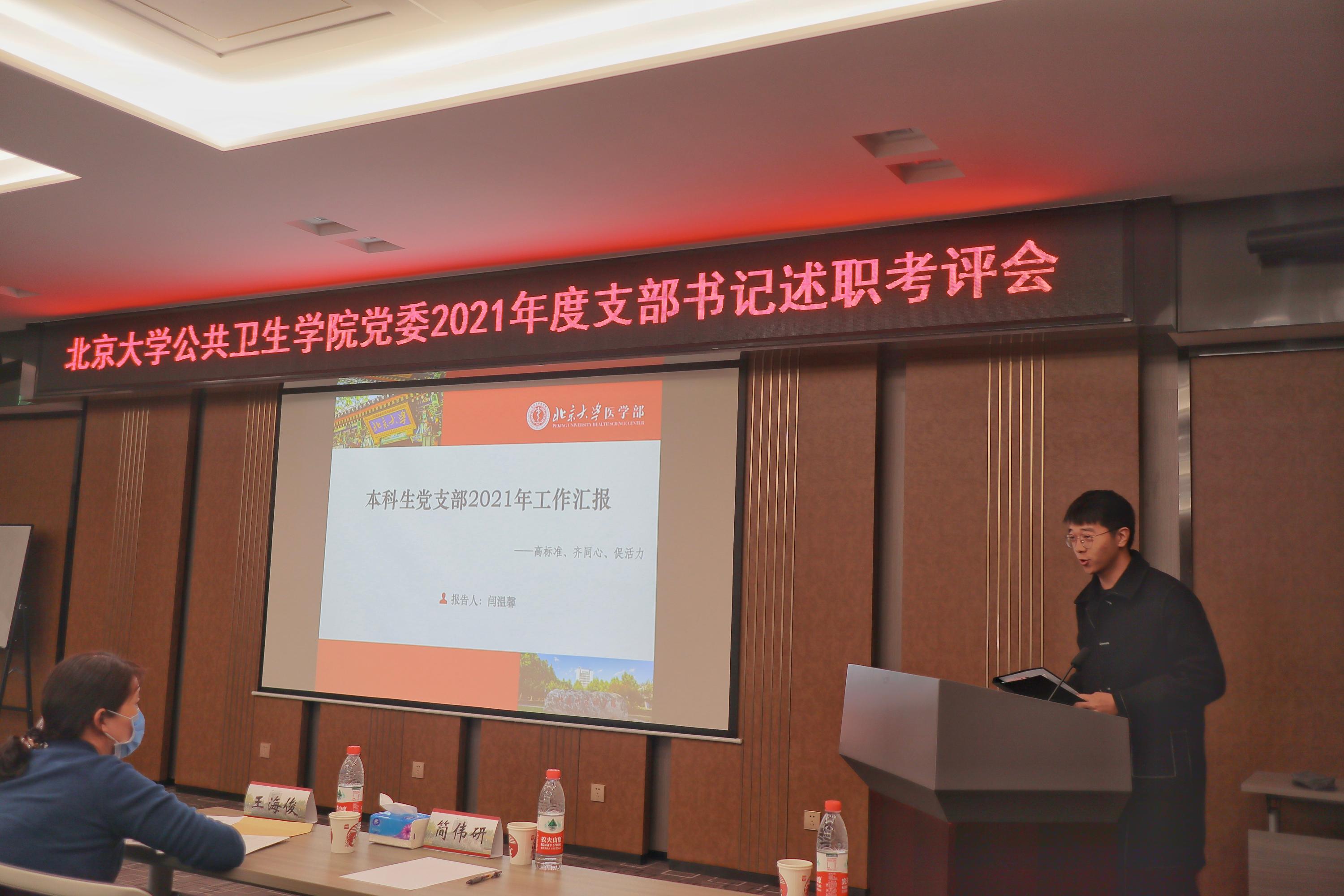 紧接着,各学生党支部书记依次进行口头述职。流行病与卫生统计学系研究生第一党支部书记杨君婷、劳动卫生与环境卫生学系研究生党支部书记王裕新、营养与食品卫生学系研究生党支部书记郭凯威、儿少卫生与妇幼保健学研究生党支部书记贾碧波、毒理学系研究生党支部书记康陈萍、卫生政策与管理学系研究生党支部书记付茜茜、社会医学与健康教育学系研究生党支部书记窦宇琪、流行病与卫生统计学系研究生第二党支部宣传委员唐泽昱(代正在冬残奥会现场服务的支部书记曹梦奇)、全球卫生学系研究生党支部书记马继炎、本科生党支部书记闫温馨先后代表本支部从支部基本情况、建设情况、党员发展和特色活动等方面对支部两年来的工作进行汇报。全体与会人员进行打分评价。