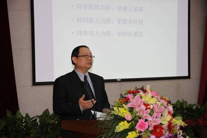 李教授指出,“传道”重在传做人之道、传做事之道、传做学问之道;“授业”则应授之以渔而非鱼,授之以理而非里,授之以势而非事;“解惑”更应从实事求是出发,具备国际视野,立足国情,做到自知之明,为新一代的青年教师指明了教育的方向。不仅要教学生做学问,还要教学生做人、做事的思路,给学生创造可以想象的空间。李老师还强调,教师也应该学会拜人为师,拜老教师为师,学做人做事;拜同龄人为师,学取长补短;拜年轻人为师,学时代潮流。关于怎么更好的教育学生,李老师有自己的见解,即欲献一瓢先取一缸,欲讲一例先读一役,科研支撑,实践保证。所谓课上一分钟,课下十年功。