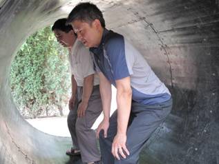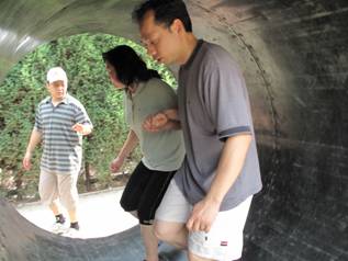 “太空行走”似乎遥不可及,可是我们今天做到了,在一个半封闭的圆桶内,队员需以不同姿势站立和往返行走,从而体验失重、眩晕的感觉。作为比赛项目,参赛选手争先恐后,院长亲自上阵,其他队员加油助威,场外“指导”忙前忙后、面授机宜,气氛异常热烈。